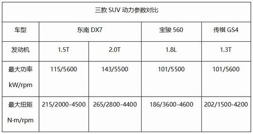 动力方面:东南DX7动力充沛,宝骏560、传祺GS4满足日常代步 东南DX7搭载了三菱4A91T的1.5T及4G63T的2.0T涡轮增压发动机,其中1.5T车型与德国格特拉克6速手动变速器相匹配。东南汽车对动力系统进行了重新设计升级和调校,这款发动机能提供最大115kW(156Ps)的动力输出,以及215Nm的最大峰值扭矩;发动机采用全铝缸盖缸体轻量化设计、低摩擦设计及电子油门等,可以有效的降低油耗。同时还有搭载韩国现代集团原装进口自动变速器的1.5T自动档车型,而且还为追求速度感和操控性的顾客准备了2.0T运动版车型。 宝骏560搭载了一台1.8L的自然吸气发动机,在同级别中动力偏弱。搭配爱信提供的5档手动变速箱,入档顺畅清晰,还略有吸入感,易于上手,但是换挡行程有些长。 传祺GS4全系只搭载了一款1.3T的涡轮增压发动机,动力表现一般。1.3T的小排量发动机在发力时不可避免的拉高转速,而给油收油的过程中,7速双离合变速箱在积极地降档、升档中难免出现顿挫。但因为小排量,传祺GS4的百公里油耗更低。 小结:宝骏560和传祺GS4在动力方面表现一般,可满足日常用车,但如果想不时感受一下澎湃的速度感,这两款车大概会让你失望。如果你对动力有一定需求且要求节油性良好,那么东南DX7会是不错的选择。 综合来看,宝骏560除了空间表现优异外,其它方面一般,但价格优势较为明显。传祺GS4虽然动力略逊,但配置、外观设计都较为出众,作为一款家用车值得肯定。东南DX7各方面表现优异——外观时尚、内饰精致、配置丰富、动力充足且节油性好,更重要的是性价比优势明显,无疑是新一代“实力王”。 |