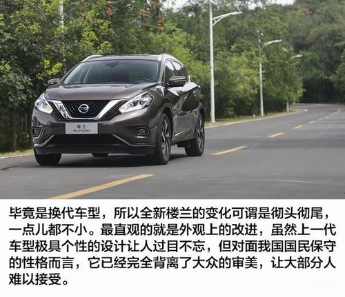 要说什么样儿的车型能够抓住大众的记忆?按常理讲,我觉得要么是在我的兴趣领域,有着出彩儿作为的“拔尖儿型”;要么就是有着好几十年悠久的历史背景,与处在不同岁数、不同生活阶段的我都 可以接上轨的“经典情怀型”;再要么就是马路上比比皆是,一抬眼皮就一辆的高销量“成功型”。不管是哪种,它们都会用漂亮的成绩勾住我的注意力。但有这么 一款车例外,它既不是我好的那一类,同时也没有太过传奇的家族史,见它的次数两只手就可以数的过来,但是也会反常规般让我时常想起,这款车就是本文的主角 -楼兰。 当然,这种挂念并不是因喜爱而萌生出来的关注,它更像是一种担忧。因为上一代楼兰在上市初期没有打好根基,尽管其品质颇高,但是车型的单一以及接近50万元的售价让其显得太过个性,消费者们并不买账,以至于楼兰一直没能在中型SUV市场找到属于自己的一片天地。虽然上一代楼兰的销量差强人意,但是这些现在也只能算是旧篇儿了,更新换代必将会把过去翻过,全新车型的问世会不会把我之前对楼兰的担忧也一并终止呢,下面我们就一起看看它的表现吧。 新一代楼兰已于8月8日在国内上市,我想不管是上一代还是这一代,绝大多数人对于楼兰的了解还是陌生的,基本上都是处于只闻其名不见其身的层面上,问8个人相信得有7个半会说听说过就是路面上没见过,所以接下来我们先简单了解一下它的过去。 楼兰有着什么样的身世? 第一代楼兰 从诞生日起至今,楼兰总共换代三次,从次数上就能看出,楼兰在同门成员中不算是前辈,但资历不老并不代表其就没有份量,在跨界SUV领域,楼兰算是一个起着带头先锋作用的狠角色。 第一代楼兰共有两驱和四驱两种驱动版本,动力方面日产为其搭载的是曾连续十四年均出现在沃德十佳发动机榜单中的VQ35DE发动机,与之匹配的是一具CVT无极变速器。该发动机在350Z以及老款天籁等日产车型上都曾服役过,最大功率为180Kw,最大扭矩则为333牛米。 第二代楼兰 在2007年的洛杉矶车展上,日产携带着第二代楼兰正式亮相发布并于次年年初上市贩售。第二代楼兰采用了用来替代老FF-L平台的日产D平台研发,该平台主要适用于日产的前驱中型车,例如我们熟知的天籁以及贵士等车型都是出自这个平台。 由于先期上市的楼兰反响较差,销量不佳,所以在2013年4月的上海车展上,东风日产追加了一款楼兰荣耀版车型的发布,该车型取消了后排座椅加热、电动后备箱以及导航等5项配置,售价也降低至36.58万元,势在通过减配降低指导价而挽回点儿市场份额。 第三代楼兰的车型和售价有变化吗? 车型选择局限性大以及高昂的售价另楼兰一直处于边缘化,上市4年始终没有踏入国内主流中型SUV的阵营当中。为了一改窘境,东风日产在全新楼兰上下了不 少功夫,仅从车型选择和售价两个方面我们就看出来了不小的诚意,相比老款的“不着调”,新楼兰的确实在了不少,车系队列得到了壮大,从之前的两款一举增加 到了9款,23.88-37.98万元的售价区间更宽裕。 第三代楼兰的定位和竞争对手? 国产件儿比例的上升肯定会缩减产品的成本,相比以CKD形式生产的老款车型,全新楼兰的售价下降也是理所应当,所以更低的价格并不意味着楼兰在档次上也会相应降低,它依旧被定位在中级SUV市场。 脱胎换骨的外观更容易让人接受 老款楼兰的侧面平淡无奇,没有什么亮点可言,除了一条腰线之外再没有多余的美化设计。相比老款那简单的侧面,新一代楼兰从大灯边缘向后延伸的弧线给车头营造出了更外扩、更粗线条的视觉感,随后转变的高硬度斜挑直线又增重了车侧的立体感和层次感。 |