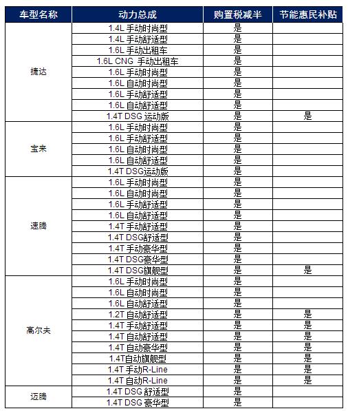 l国务院最新决定,自2015年10月1日到2016年12月31日,对购买1.6升及以下排量乘用车,实施减半征收车辆购置税的优惠政策; l一汽-大众大众品牌旗下5大主力产品的35款车型,将享受国家此次对小排量汽车购置税减半的政策优惠,优惠车型销量占整个大众品牌在售车型总销量的85%以上,成为受惠范围最大的国内合资车企; 9月29日,国务院总理李克强主持召开国务院常务会议,确定支持新能源和小排量汽车发展措施,促进调结构扩内需。会议提出:从2015年10月1日到2016年12月31日,对购买1.6升及以下排量乘用车,实施减半征收车辆购置税的优惠政策。 据此会议精神,一汽-大众大众品牌旗下迈腾、速腾、高尔夫、宝来、捷达等五大主力产品的35款车型,将享受此次车辆购置税减半的优惠政策,受惠车型销量占整个大众品牌在售车型总销量的85%以上,成为受惠范围最大的国内合资车企。按照官方指导价初步估计,每辆受惠车型将享受约2700-9000元不等的购置税优惠。另外,大众品牌在售的产品中,有9款车型还可享受国家3000元的节能惠民补贴,这两项相加,部分车型最高可节约超过1.2万元的购车成本。 以速腾280TSI旗舰版为例,官方指导价为185,800元,应缴购置税约14,200元,购置税减半则只需7100元。再加上此前3000元的国家“节能汽车惠民补贴”,用户购买该车型将获得超过1万元的优惠补贴。 长期以来,一汽-大众积极致力于对节能环保小排量、高品质汽车的研发与实践,自2013年推出的EA211系列1.4TSI、1.4L、1.6L发动机,先后搭载于旗下大部分产品,引领高效节能风潮。今年6月再次推出低排放、高效能的战略小排量EA211系列1.2TSI发动机,并率先在高尔夫车型上投入使用,受到市场欢迎,后续会陆续搭载于一汽-大众更多主力车型。在此次国家车辆购置税减半政策中全面受益的大众品牌旗下五大主力产品,在各自细分市场均以领先的品质实力、创新的绿色科技和越级的性价比优势,长期占据优势地位。 附:一汽-大众大众品牌享受购置税减半及节能惠民补贴的车型目录 |