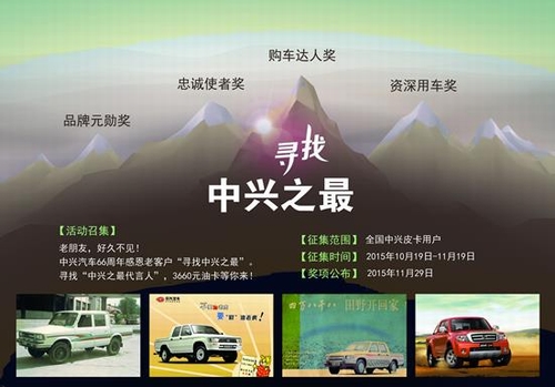 作为中国第一辆自主知识产权皮卡诞生地,中兴汽车从成立至今,已经拥有24年海外出口经验和66年品牌历史积淀,在66周年之际,中兴汽车全心全意倾情打造老用户回馈专享活动——“寻找中兴之最”,感恩广大新老用户。 你的中兴皮卡使用多久了?你的中兴皮卡行驶多少公里无大修?你拥有多少量中兴皮卡?中兴汽车66周年感恩老用户“寻找中兴之最”大型活动现已启动。只要您是中兴皮卡的拥有者,即可参与中兴之“最”评选活动,获胜者还将成为 “中兴之最代言人”,获赠3660元油卡。 据悉,此次活动的参赛规则非常开放,只要购买中兴汽车的用户均可以参加此次活动,参与即可获得中兴精美纪念品。同时,满足下列条件者,则可当选“中兴之最代言人”,并免费获赠价值3660元的油卡: 品牌元勋奖——使用年限最久。5年?10年?20年?中兴皮卡就像你的孩子,它已经陪伴你多久了?让我们来晒一晒,看看究竟谁的中兴皮卡用的最久 资深用车奖——公里数最长且无大修。5万公里、10万公里还是15万公里?它究竟跟随你翻越了多少座山峰、路过多少座桥梁?让我们来看一看,你的中兴皮卡到底有多皮实。 忠诚使者奖——拥有中兴皮卡数量最多。2辆、4辆?还是10辆、20辆?快来展示你的实力,让我们惊呆一下吧。 购车达人奖——一次购车最多(不含行业用户)。还记得那天你一次购买了多少量中兴皮卡吗?那是不是你最深刻的记忆?快拿上你的票据和照片,跟我们分享那一刻的心情。 报名方式有店头报名和线上报名两种途径。参与活动老用户到购车专卖店或当地专卖店报名,填写报名表,提供姓名、身份证复印件及购车信息(购车时间、车型等)、职业信息等,并注明参与哪一项奖项的评比。咨询电话:0312-3313805。线上报名则登陆中兴汽车官网或中兴汽车微信活动页面,按照要求提交相关信息,即可完成报名。 “这是一次极具品牌感召力的活动。”行业观察人士认为,在当前汽车行业竞争愈加激烈的背景下,用户体验和服务的价值日益凸显。经过66年的深厚沉淀,中兴汽车凭借供应链、工业制造、售后、服务等方面优势,积累了无数个忠实的用户。在不断获得新用户认可的同时,中兴汽车还不忘那些曾经支持过中兴的老用户,并去积极主动地寻找他们,与他们用心交流,一起见证中兴的蜕变与成长。 66周年感恩回馈活动已经开始,新老用户快来积极参与,超值大奖正等着你来拿! |