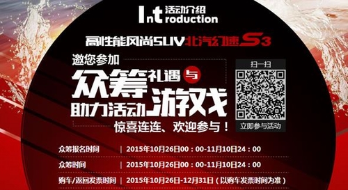 不知不觉,2015年的“双十一”即将到来,你是否早已持币待购,蠢蠢欲动了呢?即日起至11月11日,北汽幻速与汽车之家及易车商城联动钜惠,推出“交499元送2000元油卡”,“5折购车权”,“参与众筹赢千元油卡“等活动,让狂欢更实在。为了让各位北汽幻速车友在今年双十一愉快购车的同时能占上“大便宜”,北汽幻速特推出双十一抢车攻略,助你以正确“姿势”将好车好礼带回家。 双十一抢货法则一:看准时机,趁早下手 遇到喜欢的东西打折,一定要趁早下手,不然当你在犹豫观望时,想买的东西有可能早已被别人抢光,买车更是如此。现在你只需在10月26日—11月25日期间登录易车网,花499元购买“抢车”代金券,到北汽幻速经销商处购车上传发票后,就能得到499元购券款退还与两次免费基础保养。如果下手够早,还能获得额外赠送的2000元油卡,注意,只有前100名可以拿到哦。购买代金券后没有购车的车友也不用担心,499元购券款一样能退还到你手里。 双十一抢货法则二:呼朋唤友,帮手越多机会越大 如果已经错过了最佳抢货时机,也没有关系,多找一些朋友帮忙也是抢货的好方法,毕竟多一个人多一份把握。10月26日—11月10日期间,车友可以登录易车网发起购车众筹,邀请好友帮你支付1元钱购车资金。活动结束后,获得好友支持最多的众筹发起者即可获得2016款北汽幻速S3 1.5L 手动舒适型的半价购买权。 扫描上图二维码即可参与众筹活动 除此以外,活动期间参与众筹的车友前往经销商处购买北汽幻速S3车型后,还可获得千元油卡的好友助力礼(数量有限,先到先得)。独乐乐不如众乐乐,购车就“油”礼这等好事还不赶紧通知小伙伴一起参与! 获得方式: 1、众筹人数≧30人,按照发票上传时间先后顺序且通过审核的前23名网友可获得3000元油卡。 2、20人≦众筹人数<30人,按照发票上传时间先后顺序且通过审核的前49名网友可获得2000元油卡。 3、10人≦众筹人数<20人,按照发票上传时间先后顺序且通过审核的前100名网友可获得1000元油卡。 双十一抢货法则三:伺机而动,该出手时就出手 要问起网上购物怎么买便宜,答案肯定是优惠巨大但抢到概率极小的“秒杀”。本次双十一,北汽幻速将携手汽车之家推出半价秒杀北汽幻速全新SUV车型——北汽幻速S6的活动。 秒杀车型:北汽幻速S6 1.5T 手动风尚型 (秒杀成功即可享半价购车优惠) 活动于11月7日15:00开抢 (详情请当天登录幻速S6双十一秒杀页查看,敬请期待) 热心提醒大家,由于本次仅有一台北汽幻速S6用于秒杀,一定要记清楚秒杀时间,确保秒杀信息填写正确、网速正常,待秒杀时间一到马上出手,说不定这台半价北汽幻速S6就是你的了! 最后,小编再提醒一下大家,欲知更多详情,敬请关注北汽幻速官方网站(http://www.baic-hs.com/)与北汽幻速官方微信公众号,还有可能在里面找到更多的惊喜与优惠哟! |