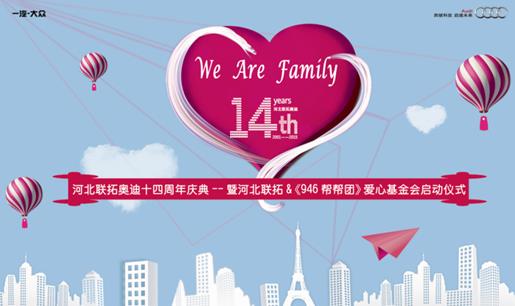经历了风雨的洗礼,跨过了彩虹的斑斓。河北联拓奥迪,已走过了14个年头,在这14年里,河北联拓感谢每一位奥迪用户的陪伴以及各位媒体人的关爱。14年来,我们秉承“以人为本,客户至上”的服务理念,14年后,我们已更饱满的热情投身于公益,汇聚家人的力量,帮助更多需要帮助的人。 11月7日,将在河北联拓奥迪展厅举办14周年庆典活动。活动当天,设置了丰富多彩的节目表演,也为广大奥迪客户量身定制多款特价车型。 前所未有的超值政策,让我们抢先看! 【你订车,我捐款】 活动当天您订车,我捐款; 【交定金,送金条,一天送一克】 活动开始之前,提前交1000元定金,就送金条,越早交,送越多(限额5克)。 【购A3,预存3000变5000,再送价值3000元延保】 活动前订购奥迪A3,预存3000元变5000元售后维修工时券,再送价值3000元1年整车延保。 【特价车型,最高直降35万元】 奥迪A4L现金直降8.5万 奥迪Q5现金直降10万 奥迪A6L现金直降25万 奥迪Q7现金直降35万 【进店即有机会获得10万大奖】 当天进店客户,扫描二维码,获赠“刮刮乐”一张,有机会获得10万元大奖哦! 【店庆续保5重礼】 ·当天续保7折优惠后再送40%维修费,还可以再抽奖,中奖几率100%(投交强也可参与抽奖)。 ·新保客户有机会获得2000元喷漆券和汽车美容项目,还可享双倍积分。 【订车参与重复抽奖】 活动当天订车即有机会获得冰箱、洗衣机、液晶电视。不订车也有奖,微信抽奖,互动奖品,奖品拿不停。 作为河北汽车行业知名企业,河北联拓奥迪也同样要肩负起他的社会责任,尽到自己的一份爱心。在14周年庆来临之际,河北联拓奥迪成立爱心基金会,帮助社会上的一些弱势群体。我们利用爱心基金会的善款,对社会生的贫困家庭、残障人士以及孤寡老人进行长期的资助。河北联拓奥迪,感谢每一位爱心人士。用我们的微薄之力,共同建设我们美丽的明天。 汇聚家人的力量,帮助更多人。 |