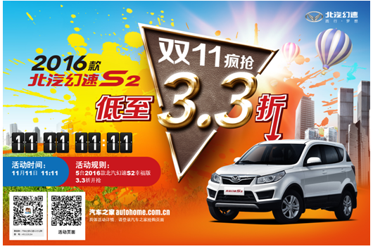 十一月已经到了,双十一还会远吗?朋友圈一大波晒单、晒购物车、晒快递的刷屏正在接近中……在这难得的购物狂欢节中,盯着购物车不如3.3折买辆车,晒什么都不如晒“幸福”。北汽幻速携手汽车之家推出2016款北汽幻速S2 1.5L手动幸福版抢购活动,专属“土豪金”限量车型3.3折仅售17754元,现已加入北汽幻速双十一大礼包,加入QQ群还有大量优惠福利畅享到年底。 低至3.3折 幸福触手可得 土豪金定制版2016款北汽幻速S2,特别的幸福优惠给特别的你!11月11日,登录汽车之家相关活动网页,即可在当天11:11时参加2016款北汽幻速S2 1.5L幸福版3.3折疯抢活动。届时将产生5名幸运儿,享受只花17754元将原价53800元的2016款北汽幻速S2 1.5L 手动幸福版开回家的超值大优惠!怎么样,心动了吗? 疯抢规则: 抢购车型:2016款幻速S2 1.5L手动幸福版车型(指定颜色为琥珀金)抢购数量:5台折扣:裸车价3.3折,为53800元X33%=17754元 抢购时间:11月11日当天11:11 抢购链接:http://mall.autohome.com.cn/detail/42729-0-0.html抢购方式:琥珀金色仅设置5台库存,按用户成功创建订单的先后顺序进行抢购,抢完即止。 加入专属QQ群 优惠畅享到年底 除了3.3折超值特价抢购之外,汽车之家还为想要购买2016款北汽幻速S2 1.5L幸福版的用户组建了专属购车福利QQ群(491326184)。11月1日-12月31日期间,这里不仅会放出独家视频版双十一抢购攻略,还会为大家提供三大会员专享福利。 第一重福利--购车认证礼 群内用户在支付订单后,发送订单号、购车人姓名与支付订单截图发送给群主进行确认,认证成功后即可获得汽车之家金属车标一个。 第二重福利--提车祝贺礼 提车后前往汽车之家北汽幻速S2论坛发帖,还可再得500元油卡一张。 第三重福利--介绍购车礼 QQ群内会员成功介绍朋友进群并购车,更可获得100元充值卡1张(该礼品可累积,上不封顶)。 除了以上固定福利以外,该QQ群内还会在第一时间发布车型相关的优惠信息,想要购买2016款北汽幻速S2 1.5L 手动幸福版的大家一定不能错过! 火热双十一,北汽幻速购车惊喜全面出击!趁着优惠大,赶紧抢辆超值2016款北汽幻速S2幸福版才是正经事!据悉,双11当天汽车之家北汽幻速S2幸福版还有更大惊喜,敬请期待!更多活动与优惠敬请关注北汽幻速官网及微信公众号。 |