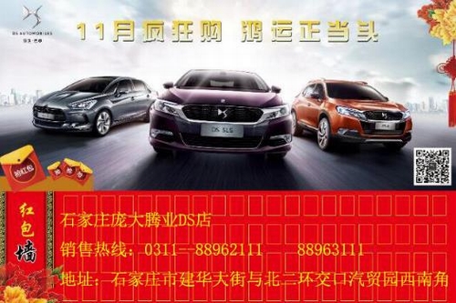 疯狂的双11你熬夜抢购了吗?刺激吗?还有更刺激的事呢,比双11更疯狂。11月21日“女神”DS带你疯狂2小时,来庞大腾业DS店进门继续送红包,3000元现金红包等你拿,更有特价车型限时限量抢购,抢到就真的赚到了! 时间:11月21日上午10:00—12:00 地点:石家庄市建华大街与北二环交口国际汽贸园西南角 热线:0311—88962111 88963111 庞大腾业DS店携DS 6、DS 5、DS 5LS共13款1.6THP购置税减半车型,恭候您的光临! 石家庄庞大腾业DS店 销售热线:0311--88962111 88963111 地址:石家庄市建华大街与北二环交口汽贸园西南角 |