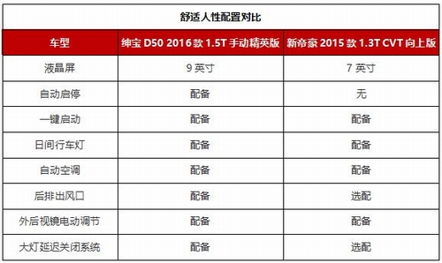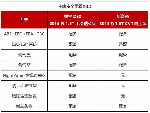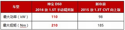 T动力之争,绅宝D50欺负吉利新帝豪? 都说买车要看三大件,特别动力是最重要考量因素,因为这不仅仅关系到驾驶体验,更包括后期的使用成本。2016款绅宝D50搭载了1.5T涡轮增压发动机,最大功率为110KW,最大扭矩为210N.m。而新帝豪则搭载1.3T动力,最大功率为110kW,最大扭矩为185Nm。仅从排量数据来看,似乎绅宝D50欺负了新帝豪。 然而,从技术层面来看,绅宝D50的动力优势却是无可挑剔。2016款绅宝D50搭载了来自三菱的1.5T涡轮增压发动机, 该发动机因采用三菱独有的MIVEC技术——智能可变气门正时与升程控制系统,具备小排量、大动力、低油耗等优势。此外,其动力输出稳定线性,加速平顺性优异。而新帝豪所搭载的吉利自主研发的1.3涡轮增压发动机,由于没有缸内直喷等先进技术,动力上只达到自然吸气发动机1.8L的水平。 从上面的对比可以看出,无论是从数据上还是技术上来说,绅宝D50都占有绝对优势。 配置都是争分项,绅宝D50险胜新帝豪 自主品牌车型一向在配置上出手阔绰,绅宝D50和新帝豪在这方面的表现也不例外,都非常有诚意,两款车型无论是在安全配置还是舒适人性化配置方面都下足了功夫。 人性化配置方面,绅宝D50本身表现就很优秀,后排出风口、真皮座椅、大灯延迟关闭、电动外后视镜等、多功能方向盘、大尺寸液晶屏等流行配置一应俱全。2016款北汽绅宝D50在原有车型基础上新增了一键启动、自动空调、日间行车灯等多项中高级配置。其中,冠绝同级的9寸汽车中控显示屏,不仅集成了GPS导航、倒车影像等功能,还新增手机互联功能,并支持安卓、苹果两大手机系统,轻松实现人车互动的车载互联体验。而新帝豪则没有自动启停等装配,7英寸中控液晶显示屏也显然没有9英寸屏幕更具科技感。 在安全配置方面,两款车型都非常用心,但绅宝D50更显丰富。两款车型均配备有ABS+EBD,ESC电子稳定控制系统,并拥有倒车影像、大容量安全气囊、ISO-FIX儿童座椅接口等一系列安全配置。此外,绅宝D50还配备有胎压自动监测、疲劳驾驶提醒等中高端车型才有的安全配置。而源自SAAB的Night Panel航空夜视仪表功能,乃是同级别的独有配置,可以在夜间行车时选择关闭仪表盘多余光源,以减少对驾驶员的干扰。 空间谁更大度?绅宝D50和新帝豪不相伯仲 仅从车身数据来看,两款车型的轴距相同,均为2650mm,相比之下新帝豪在车身长度方面更具优势,拥有4631mm,而绅宝D50的优势则表现在宽度和高度上,分别为1794mm和1486mm,拥有更宽适的空间表现。 (图片源自易车网) 车身尺寸方面的特点,也同样表现在车内乘坐空间上。绅宝D50的优势表现在头顶空间,其前排头顶空间为920mm-940mm,而新帝豪仅为880mm,而后排头顶空间上,绅宝D50为950mm,而新帝豪为910mm。但是新帝豪的在腿部空间上占据优势。但绅宝D50座椅的上下和前后调节功能则使其空间灵活性方面比较有优势。 绅宝D50拥有405L的后备箱空间,而新帝豪后备箱容积为680L。两款车型的后排座椅都可以按照4/6放倒,绅宝D50放倒后最大深处为1700mm,宽度为1310mm,而新帝豪略显优势,放倒后最大深处为1970mm,宽度为1530mm。但绅宝D50的后备箱空间更为规整一点。 经过上面的分析,可以明显感受到绅宝D50的优势。作为两款T动力的自主品牌紧凑型产品,绅宝D50和新帝豪在争夺家轿之王时已经全面开战。而在关乎最终决定成交的价格方面,绅宝D50更具有吸引力,其官方指导价9.68万元本就比新帝豪价格低1000元,在此基础上,现在购车即享受着1.5万元的官促现金优惠、节能惠民补贴、购置税减半的三重优惠,整体优惠幅度超过2万元。也就是说,7万多块钱就可以把绅宝D50开回家。此外,绅宝D50无论从动力、配置还是空间方面,都有值得称道的地方,近期考虑购车的朋友,可以说入手正当时。 |