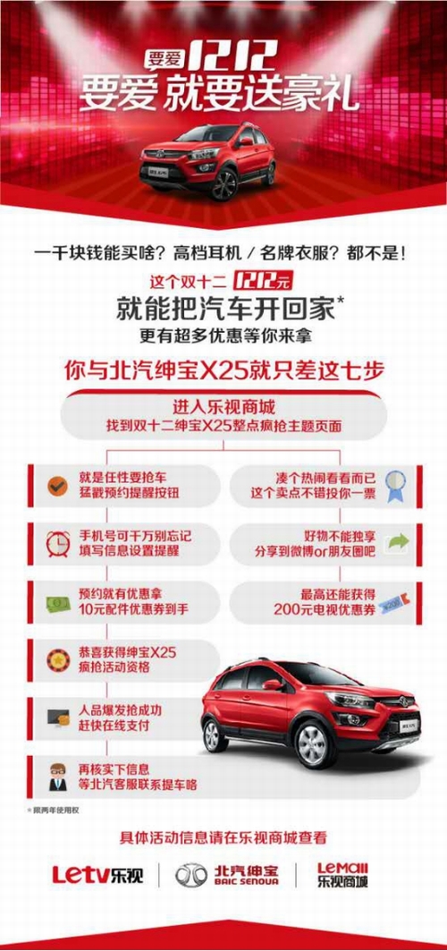 “双11”刚过,“双12”又如期而至,各种打折促销让人应接不暇,但最能让人尤其是想买SUV年轻一族眼前一亮的,当属北汽绅宝和乐视之间恋情的新进展:根据最新透露的信息,12月1日至12日期间,北汽绅宝联合乐视商城打造了绅宝X25“双十二”系列秒杀活动:只要1212元即可获得近期人气爆棚的A0级SUV——绅宝X25的两年使用权,并有机会获取乐视商城多款商品优惠券。 仅需1212元 轻松获得绅宝X25两年使用权 此次北汽绅宝携手乐视推出的“北汽绅宝X25秒杀”活动,从12月1日正式开启,至12月12日结束,为期共计12天。期间共计推出12台绅宝X25供网友秒杀。12位幸运一族,将以1212元象征性的价格,将这款任性轻松SUV收入囊中。同时,参与北汽绅宝X25车型亮点投票并转发微博的网友,可以最高获取双12当天200元电视优惠券。 据悉,整个秒杀活动分为三个阶段: 一、12月1日至12月7日 在此期间,网友只需登陆乐视商城绅宝X25活动页面,预约提醒即可获得参与秒杀资格,随后系统将会在秒杀开启前自动发送秒杀时间提醒。同时,预约成功并分享至微博的网友,将获得“双12” 乐视商城配件及娱乐周边10元优惠券(需要在12月8号-12号使用)。 二、12月8日至12月11日 12月8日,北汽绅宝X25秒杀正式开始。每天中午12点整点秒杀,每天一场,每场1台,共计4辆绅宝X25供获得秒杀资格的网友秒杀,最终将产生4名幸运网友。当然,这也是考验各位网友网速、手速等秒杀功力的关键时刻。 三、12月12日12点-19点 随着12月12日,绅宝X25在全国12城市同时上市,秒杀活动也将达到高潮,当天将推出8辆绅宝X25供网友秒杀。活动从12时准时开启,每隔1小时秒杀1辆绅宝X25,至19时正式结束,最终将产生8名幸运网友。 惊喜连连看,12月12日终极揭晓 通过参与以上活动,整体算下来,幸运的网友将可同时获得“绅宝X25两年使用权+200元乐视电商现金券+其它乐视产品优惠劵”,惊喜大大的感觉有木有。除秒杀行动外,更值得一提的是, 12月12日上市当天,乐视将全网云直播北汽绅宝X25上市活动,可实现四屏高清同步收看,对绅宝X25兴趣满满的网友可以足不出户观看绅宝X25上市。 “惊喜”一词,已成为绅宝X25的标签之一。事实上,惊喜不仅仅限于此。据北汽绅宝内部人士透露: 12月12日上市当天,北汽绅宝与乐视将会公布双方更多层面的合作,将给所有年轻用户,尤其是给绅宝X25与乐视的用户,带去更多的惊喜。 领先同级的卓越实力,携手乐视与年轻网友进行惊喜不断的对话式营销,一路“玩出彩”的北汽绅宝X25,目前已经成为关注度最高的小型SUV之一。至于接下来将与乐视再擦出什么样的新火花,未来还将有哪些惊喜? 12月12日见! |