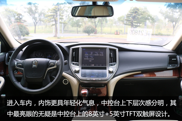 新型设计尾灯菱角分明,内部采用LED光带设计,夜间点亮后非常醒目,且极具延伸感和科技感。 外观颜色上,除了之前的五种选择外,随着全新皇冠2.0T车型的导入,增加了深棕云母金属色。 内饰和空间 进入车内,内饰不再是过去那种有点商务沉稳的感觉,而是更具年轻化气息。中控台上下层次感分明,其中最亮眼的无疑是中控台上的8英寸+5英寸TFT双触屏设计,显得很有科技含量,上面的大屏幕可以控制多媒体系统,下面的小屏负责车辆空调和驾驶模式等功能,实体按键只有5个,减少到了最少的程度。 方向盘相比上一代也要美观时尚了不少,不仅立体感更强,手感方面也十分出色,多功能按键可以控制蓝牙、多媒体系统等功能,采用按键和拨杆的结合,符合人体工程学,操作相当便利。另外,还可上下、前后电动调节方向盘。 |