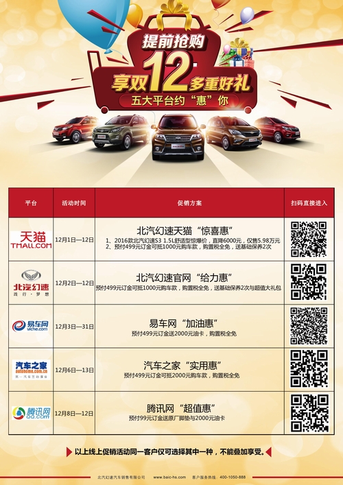 车友们还记得北汽幻速双十一那疯狂的秒杀和抢购吗?是不是后悔当初只是犹豫了那么一下,特价好车就已经被人抢走了?如果你错过了双十一的3.3折,那么双十二的购车狂欢一定不能再错过!这一次,北汽幻速在官网、天猫、汽车之家、易车网、腾讯网五大平台,同步启动双十二线上购车大促,推出惊爆特价、订金增值、购置税全免、超值大礼包、油卡等诸多网上购车专属福利等你来抢. 热销车型双十二特惠来袭 5大平台陆续上线 冬季固然寒冷,但双十二当前,大家"买买买"的热情依然不减.眼看2016就在眼前,何不考虑为家里添置一辆来年出行好伙伴? 今年双十二,北汽幻速优惠接"2"连"3",高性能风尚SUV北汽幻速S2和持续销量过万的北汽幻速S3等北汽幻速明星车型助阵,即将上演一场双十二火热"嗨购Show"! 即日起,关注汽车之家、易车网、腾讯网与北汽幻速官网、天猫北汽幻速汽车官方旗舰店5大平台相关活动页面,在线购买北汽幻速S2/S3(除创业版)、北汽幻速H2这三款热销明星车型,即可享受由北汽幻速厂家提供的2016款北汽幻速S3惊爆特价以及"购车订百送千","提车0购置税"、"超值用车大礼包"等特别购车优惠. 超多购车优惠福利可选 总有一款是你的菜 好不容易等到喜欢的车优惠,转眼又发现优惠并不合心意?没关系!本次双十二为了让客户获得最直接、最称心的优惠,北汽幻速特别推出了多种购车福利让消费者选择. 北汽幻速贴心为消费者在5大平台分别推出不同购车政策.天猫北汽幻速汽车官方旗舰店原价6.58万元的2016款北汽幻速S3 1.5L舒适型仅售5.98万元;汽车之家预付499元订金可抵2000元购车款再送最高5880元全额购置税;腾讯网预付99元即送2000元油卡及脚垫……优惠多得想不到,总有一款是你的菜! 给力双十二,北汽幻速明星车型钜惠压轴,迎接新年气象!赶快抓住这次难得的机会,挑个喜欢的优惠将爱车开回家吧,不仅春节串门有面子,出门游玩也更加方便! |