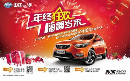 过完万圣节、感恩节,接着又盼圣诞节,当下年轻人对舶来品节日似乎乐此不疲.于是乎,商家也跟着年轻人的脚步一个个节日狂欢起来.而让小编万万没想到的是,来自天津一汽的骏派D60竟然会这么玩.作为上市以来一直主打年轻人市场的新生代都市SUV,骏派D60为与年轻人一起嗨翻岁末,投入近百万,从今日起,特别推出圣诞节"花式"购车惠活动,从选车、购车到交税,环环优惠,环环惊喜,最高优惠近7000元. 环环优惠,环环惊喜 在小编看来,为了迎接此次的圣诞节,骏派D60铁定是"疯了",有种誓将与年轻人疯玩到底的节奏.到底怎么回事呢?且听小编慢慢道来. 我们都知道,在购车之前,大部分人都会经历一个或长或短的选车阶段.通常在这个阶段,商家鲜有做优惠活动的.但是,骏派D60却打出了"不买也可以,奖品照拿不误"的口号.也就是说,即便只是来骏派D60官网逛两圈,并在活动官网进行注册,即有机会获得原厂车模以及100元电话充值卡. 假使经过一番产品对比,最终决定购买骏派D60了,还可参与店头抽奖,中奖率为100%.最高奖项3000元加油卡,其次是1000元京东卡、大小车模、100元京东卡.其中,3000元加油卡,算算,够省半年多油钱了. 车买完,总得交税吧.有一种省钱的法子,小编可以分享给大家,就是购买骏派D601.5L车型,可以享受国家购置税减半优惠政策,最高可节省3415元.目前,骏派D60全系在售车型,有6款1.5L车型可供选择,总有一款可以入你眼. 内外兼修,值得选购 对于这么给力的优惠,小编心想,这不会是产品品质不够,促销来凑吧.据小编了解,事实并非如此. 骏派D60,是天津一汽整合全球500强优质供应商资源,为年轻人打造的一款精致又时尚的动感都市SUV.面世以来,骏派D60凭借"高颜值、高动力、高安全、高科技"获得了广大用户的良好口碑,长期位居汽车之家等知名汽车网站的竞品口碑排行榜首位. 外观造型,由全球知名的意大利宾尼法利纳公司亲自操刀设计.设计时,骏派D60大胆突破传统,融入了更多的运动与时尚元素.整车大量运用流线元素,造型流畅时尚而不失凌厉.特别是其画龙点睛的棱角设计,可谓神来之笔,让整车气场倍增、霸气十足. 动力方面,目前,骏派D60提供了1.5L和1.8L两种动力配置. 其中,1.8L车型,搭载丰田2ZR发动机,拥有102 kW 最大功率,扭矩峰值可达170 N?m ,并与爱信原装进口6速手自一体变速器相匹配,高效动力瞬间引爆,而且换挡冲击小,有效减轻发动机的磨损和噪音,油耗也更低.小编要说的是,相比较国内1.8L丰田动力的其它品牌车型价位普遍在12万以上,8万元即可拥有丰田动力的骏派D60具备超高性价比. 安全方面,骏派D60以59.6分获得C-NCAP"五星安全"评价,成为C-NCAP史上得分排名第一的SUV.而且,整车采用TCS牵引力控制系统、ESC车身稳定性控制系统、TPMS胎压监测系统等"十位一体"主动安全配置,可以有效协助驾驶员操控车辆,防止意外事故的发生.此外,在车内健康安全方面,骏派D60内饰设计及工艺全部由日本丰田纺织承担,采用通过欧洲ELV测试标准的无毒环保材料;同时搭载日本电装空调系统,使得空气净化能力达到92%. 智能配置方面,骏派D60还装配了"无钥匙进入+ 一键启动"两大智能舒适配置,这一般在价格二十万以上的车型中才会有所配备.车主只要把放在口袋或包里的车钥匙靠近车身,车辆会自动识别,随即车门自动开锁,便可进入车内;随后,车主无需插入钥匙,只要踩下刹车,轻点按键即可启动车辆. 这样一款都市精品SUV,官方定价仅有6.49-9.99万,放之国产自主SUV中,确实属于经济实惠型.小编认为,有意购买小型SUV的用户们,何不入手一辆骏派D60试一试呢?相信,骏派D60,不论是送自己或是家人,都是一件不错的圣诞大礼. |