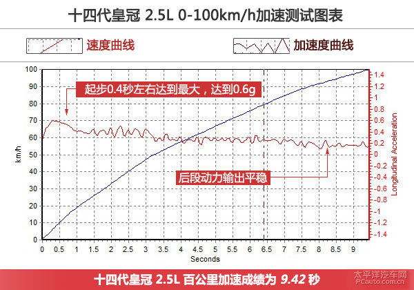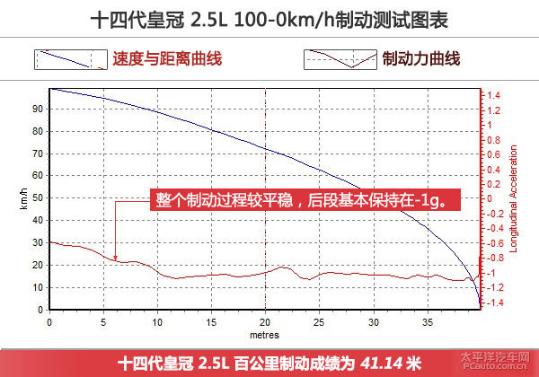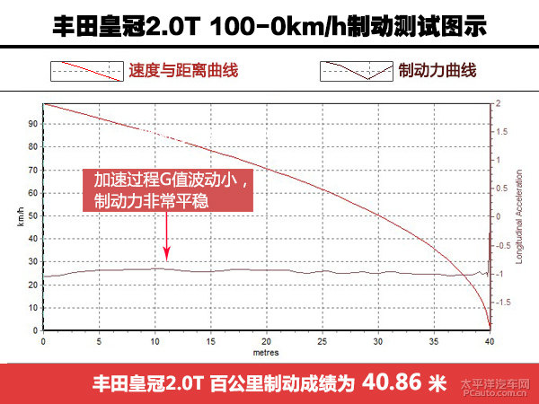 测试:百公里加速7.82 ● 0-100km/h加速测试 将驾驶模式调至SPORT,并关闭ESC,起步时后轮有明显的打滑现象,损失了不少的时间.虽然底盘调教偏向舒适性,但完全能招架住动力瞬间爆发而产生的抬头现象,整体姿态稳健. 实测0-60km/h的加速时间为3.63秒,而0-100km/h的加速时间为7.82秒,其实这一成绩并非其最佳的,因为测试时的条件有限,并未能进行多次测试,假如更好地配合起步时的油门,让打滑损失更少,相信这台皇冠2.0T将会获得更好的成绩. ● 100-0km/h制动测试 偏软的悬挂在全力制动时让车身有较为明显的点头,实测的40.86米的制动成绩仅属于中规中矩,还好整个刹车过程的制动力释放非常平均,整个加速度基本维持在-1. ● 2.0T VS 2.5L 之前我们也曾对皇冠的2.5L车型进行了性能测试,不过需要提醒的是,这个对比的内容并非通过同一场地同一客观条件下进行测试,因此仅作为参考. 虽然这种对比并非十分严谨,但从上表可以可以肯定的是,2.0T发动机的动力表现相对于2.5L车型来说还是有质的领先,而且从实测7.82秒的0-100km/h加速时间以及具体试驾表现来看,这台2.0T对于皇冠大部分的用户或者潜在消费者来说已经动力过剩了. 整体评价:或许使用2.0T只是一个无奈之举,但皇冠依然交出令人惊叹的成绩.2.0T引擎的表现让人印象深刻,在提供非常不错的动力同时,依旧保持着皇冠一贯而且应该延续的平稳舒适,而实测的7.82秒的百公里加速也让动力从此不会成为皇冠的诟病.不过同样留给了消费者一个难以取舍的抉择,究竟是选择动力更好的2.0T,还是输出质感更佳的2.5L?这就好比在结婚前夜被一个漂亮的女孩表白那般纠结. |