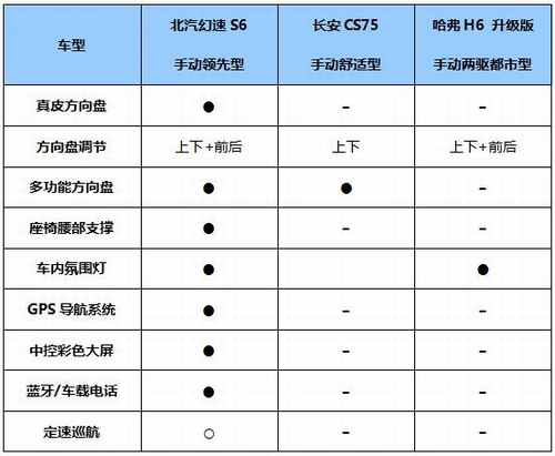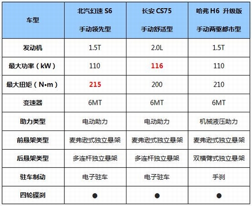 第二轮:配置一较高下 市场的火爆,使得10万元左右的自主SUV层出不穷.除了耐看的外观,配置的丰富性也成为了当下消费者选车的关键. 就配置来说,刚上市的北汽幻速S6的确拥有较大的优势.该车不仅拥有其他两款车型都没有的带GPS导航与倒车影像功能的中控大触摸屏、驾驶座腰部支撑、自动恒温空调、胎压监测装置与前排侧气囊,带上下前后四向调节多功能真皮方向盘、无钥匙进入/启动、车内氛围灯等配置一应俱全,不仅安全舒适更具人性化,还能选配定速巡航系统,以高性价比著称的行业黑马北汽幻速,这次依然没有让人失望. 第三轮:拼动力赛操控 动力及操控方面,北汽幻速S6与哈弗H6均搭载1.5T涡轮增压发动机,由于CS75使用的是2.0L发动机,在最大功率上占了一定优势,而北汽幻速S6以215N·m的最大扭矩,搬回了一成.传动与制动方面,三款车型都使用了6速手动变速器与四轮碟刹,北汽幻速S6与CS75配备了更加轻松省力的电子手刹,而哈弗H6则配备的是传统手刹. 北汽幻速S6手动领先型发动机舱 底盘作为整车性能的基础,为了全面照顾车辆的舒适性与操控性,北汽幻速S6与CS75都选择了前麦弗逊后多连杆四轮独立悬架系统,北汽幻速S6的底盘更经过英国米拉公司的专业调校,再加上该车配备的电动助力转向、车身稳定控制、上坡辅助等行车辅助系统,能够为驾驶者提供更加优越的使用感受. 北汽幻速S6手动领先型底盘 从以上的各项关键参数的对比中我们可以看出,在市场上初露锋芒的北汽幻速S6,是同等价位中绝对的"性价比高手".那么在北汽幻速对产品快速布局,红海大战竞争越发激烈的当下,北汽幻速S6是否能如预期在短时间内突出重围,成为又一市场中的佼佼者,就要看消费者们买不买这笔精明的账了. |
