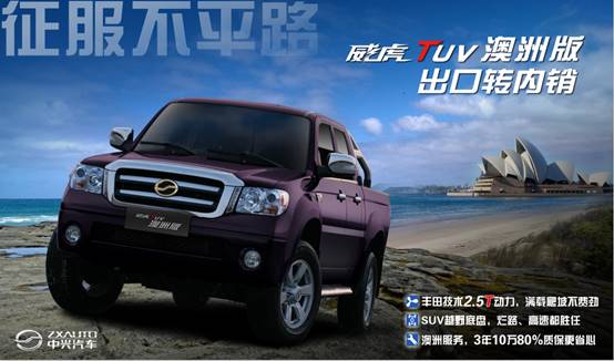 随着近年国家城镇化战略的不断深化,实用性极强的皮卡车受到更多人的关注和青睐,皮卡市场也随之升温。作为国内老牌皮卡专业制作商,中兴汽车威虎家族全新产品系列--威虎新TUV将于2016年1月全面上市,威虎新TUV秉承威虎一贯硬派风格,在外观、内饰、配置和性能上进行了全面升级,车型包括威虎新TUV澳洲版和威虎新TUV五十铃版两个系列产品。其中威虎新TUV澳洲版主打高性能和高服务,而威虎新TUV五十铃更强调性价比与实用性。具体产品系列车型如下: 威虎新TUV亮点多多,准备在春节前买皮卡的朋友们可要注意啦,首先让我们认识一下上面这款神秘的威虎新TUV澳洲版吧。 澳洲出口 实力见证 作为威虎家族中的新成员,威虎新TUV澳洲版是按照欧盟及澳洲技术、安全、法规打造的全新产品,拥有纯正的澳洲血统,产品在澳大利亚历经26个月、7000公里全路况验证,通过28项法规,获得2大认证,从零部件到整车达到ECE欧规标准、满足澳规ADR标准,成功登陆澳洲市场! 威虎新TUV澳洲版载誉回归中国市场,将凭借“最强动力、最强底盘、最强服务”的三强标准回馈国内用户。国内用户不出国门便可享受澳洲国际高品质,用到地地道道的出口车。 超强品质 超前领先 威虎新TUV澳洲版,动力优势无可比拟。汽油车型搭载4G69发动机,性能卓越;柴油车型搭载的丰田技术2.5T发动机,原机曾广泛用于丰田海拉克斯皮卡、普拉多和海狮等车型,采用博世高压共轨系统,精准控制喷油量、时间及压力,更省油;双顶置凸轮轴DOHC,16气门,提高充气效率,降低排放,更环保。皮带传动,无间隙齿轮传动,降低噪音和震动,更安静。经澳洲本土调教,发动机净功率达95Kw,净扭矩316Nm,可以说动力优势能秒杀国内市场同级别竞品。 威虎新TUV澳洲版的越野底盘,由国际著名PRODRIVE公司进行专业调教,其行驶稳定性尤其是高速转弯的侧倾稳定性更强,满载状态下不下沉,车身承载性也更加突出。同时匹配245轮胎,离地间隙210mm,具备同级别车型最大的通过性。 此外,威虎新TUV澳洲版在外观造型、内饰科技感、座椅舒适性、人机系统完善等细节方面也非常惊艳:国内皮卡首家标配日间行车灯,首家标配手机互联娱乐系统!超前领先国内市场,实力回馈新老用户;另外不锈钢踏板、高强度护栏、SUV级舒适座椅、胎压监测、倒车影像、专属金色logo等魅力组件,同样让人眼前一亮! 澳洲服务 售后无忧 别人保的我也保,别人不保的我还保,为您省心省钱,解决用车后顾之忧。 中兴威虎新TUV澳洲版荣耀归来,让国内消费者率先享受到澳洲超高服务标准:“BUMPER TO BUMPER”即BTB服务,全车从前保险杠保修到后保险杠3年10万公里超长保修,零部件质保率达80%,且包括大部分易损易坏零部件,遥遥领先于国内同级产品2年5万公里保修标准,是皮卡中保修里程最长和保修项目最多的车型。不仅如此,中兴威虎新TUV澳洲版更独家推出VIP专属服务,为车主提供保姆式提醒服务、VIP专修工位等服务,让用户开的舒心,用的更放心! 当然,如果您觉得威虎新TUV 澳洲版的性能对你的使用需求有些过剩,那么威虎新TUV五十铃产品也是一款不错的选择,匹配纯正五十铃动力,成熟稳定,最大功率75Kw,最大扭矩220 Nm ,同样比同级别竞品具体明显优势。 底盘方面同样沿袭了威虎家族一贯的底盘技术优势,另外内饰外观多方位优化提升,更精致时尚,如果您更注重实用性和性价比,这款车将是您的不二选择! 轻松坐享超高国际品质,真切感受全新驾乘体验!相信作为国内老牌皮卡车企,中兴汽车倾情打造的威虎新TUV车系会给消费者带来更多更好的选择。 |