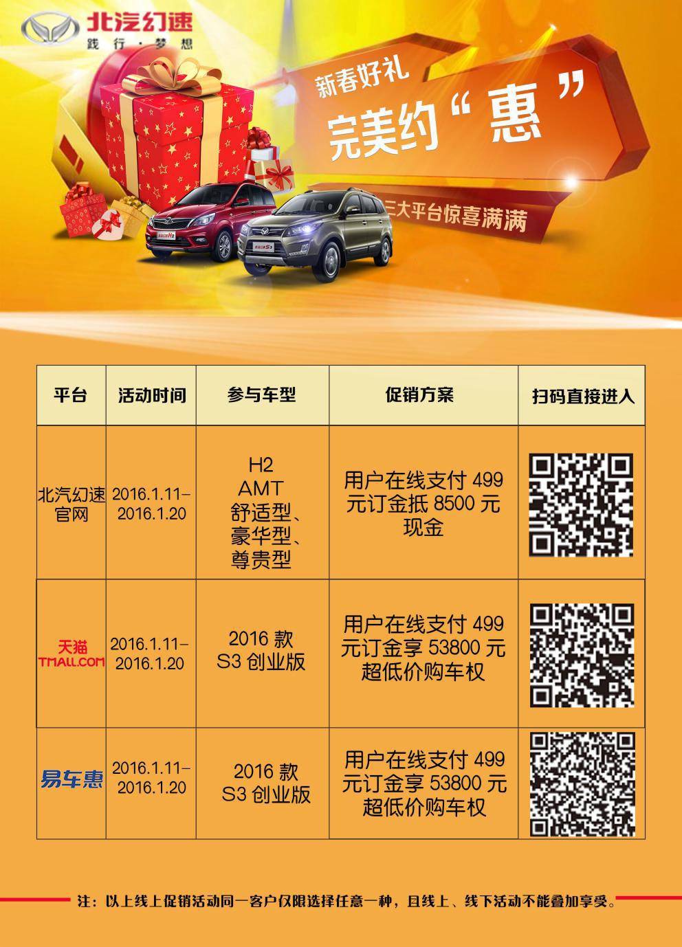 刚刚告别了新历的2015,农历的猴年又将至.眼看新春佳节越来越近,盼望着阖家团圆的你,真的做好了准备了吗?不管你是费了大劲搞定了12306的验证码,还是选择了"曲线救国"的方式绕路回家,可经历过"春运大潮"的洗礼之后,难免会让人"元气大伤".不如趁着北汽幻速"新春购车节",挑辆超值7座车送给忙碌了一整年的自己和家人,将难得的团圆变得更加简单快乐一些. 迎金猴喜送福 北汽幻速7座热销车型特惠来袭 春节回家过年,难免会走亲访友,每到这个时候就会发现,平时开的5座代步车挤不下家里的三代同堂,真是"车到用时方恨座儿少",不如果断换个经济又舒适的"大7座"! 2016年1月11日--2016年1月20日,北汽幻速官网、北汽幻速天猫旗舰店、易车惠三大线上平台将同时开启北汽幻速"新春购车节"活动.活动期间,登录以上平台购买北汽幻速H2 AMT舒适型、豪华型、尊贵型与2016款北汽幻速S3创业版这4款热销7座车型,在线支付订金即可获得特惠购车资格的惊喜优惠. 贺新春购超值 预付499元即可享受特别优惠 年关将至,年货总得买,红包也要发.是不是觉得辛辛苦苦一整年,过个春节钱包立马回到"解放前".总愁钱不够花,不如干脆买辆车当年货换一个心里踏实. 北汽幻速"新春购车节"活动期间,登陆相关活动页面购北汽幻速H2全部AMT车型预付499元抵8500元现金购车款,发布提车作业更可获得1000元油卡,成功申请为精华帖后再加送500元油卡;购2016款北汽幻速S3 创业版预付499元享53800超值特惠价,直省4000元!不仅轻松为家里添置了一个"大件儿",还能足足省下一笔年货钱! 北汽幻速"新春购车节",金猴献惠送吉祥,本次全部活动车型均可享受国家购置税减半政策!好不容易赶上了2016年开年优惠与福利,赶快将心仪的爱车开回家,在猴年即将到来之时,为您和您的家人送上一个"7"乐融融的"开门红"吧! |