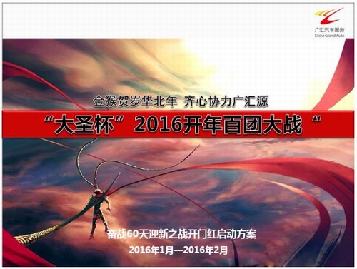 回望刚刚过去的2015年,广汇汽车股份有限公司硕果累累,继续领先中国乘用车销售,是中国排名第一的乘用车销售商、中国最大的乘用车融资租赁提供商及中国汽车经销商中最大的二手车交易代理商,拥有行业领先的业务规模、突出的创新能力,是中国乘用车经销及服务行业中的超级航母,在广汇汽车的引领下广汇汽车华北大区更是一枝独秀. 广汇汽车华北大区2015年全年,公司实现营业收入约273亿,新车销量约20万台.截至2015年末,公司建立了覆盖6省2市的管理格局,拥有108间门店,1万多名员工,经销逾23个乘用车品牌.在扩大规模的同时更创造了全新的省区特色化管理. 为了提升 2016 年大区业绩,提升全体员工斗志,增强集体荣誉感.经大区管理层提议,在华北大区隆重推出"大圣杯"2016 开年百团大战"--奋战 60 天"迎新之战"启动方案,寓意华北大区万名员工在"认真、用心、激情、信念、决心"的企业文化感召下,努力拼搏、奋勇争先的气概,通过本方案的推动,利用春节前后的市场需求高峰,冲刺 1、2 月份业绩,力争猴年首战开门红,各项管理工作得以提升,为 2016 年开创新的局面. 本次竞赛有四个军团参加,它们分别为:23家4S店组成的河北军团、34家4S店组成的山东军团、33家4S店组成的河南军团,以及18家4S店组成的山西/江苏军团.竞赛考核内容由扣非净利、销量、维修产值、装饰产值、保险佣金、车贷佣金、二手车佣金6个指标,以及大区管理层根据各军团实际情况,设立的指标目标值组成. 本次竞赛除设有最高荣誉"大圣杯"奖项之外,还设置了军团/条线全圣、智圣、优圣三种奖项.首先,竞赛将在各军团分条线进行,每个条线的前3名分获条线三圣,即条线全圣、条线智圣和条线优圣.然后,各军团内部再进行综合比拼,6项考核指标综合成绩的前3名,将获得各自军团的全圣、智圣、优圣奖.最后,四个军团的"全圣奖"得主,将代表各自军团争夺华北大区的的最高荣誉--"大圣杯". "大圣杯"竞赛方案一公布,山西江苏省区各店面纷纷召开动员大会,积极制定军团内部竞赛方案,并在各店面以多种形式进行宣传.相信通过此次"大圣杯"竞赛,山西江苏省区各项业务的业绩都将实现新的突破. 猴年贺岁,大闹天宫,四大军团,强强交锋,"大圣杯"最终会花落谁家,让我们一起拭目以待吧! |