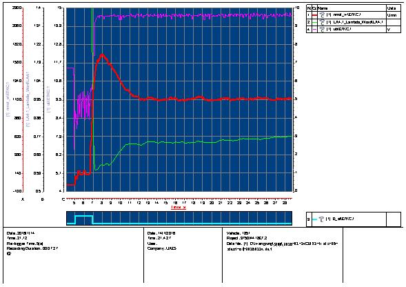 高寒试验的地点黑河位于东北边陲,全年有半数以上的时间日平均气温低于冰点(0℃),冬季夜间最低气温可达零下三十度,为了全面掌握每个低温点的启动情况,工作人员往往要从早上六点工作到晚上十二点。这对于工作人员与测试车辆都是严峻的考验。经过10天的努力,2016款野马T70顺利完成高寒测试,至此,野马T70三高试验工作全部完成。在整个过程中,测试车辆在-10℃~ -30℃的环境温度下均能正常启动,展示了良好的重复启动性和驾驶稳定性,暖风和油路也表现良好,电器检查正常,OBD监控功能可靠。下图为测试车辆在零下-26℃下的启动曲线,经过反复标定,在此低温情况下,发动机启动时转速上冲有力,启动迅速,时间为1.9s,保证了启动的可靠性、安全性。