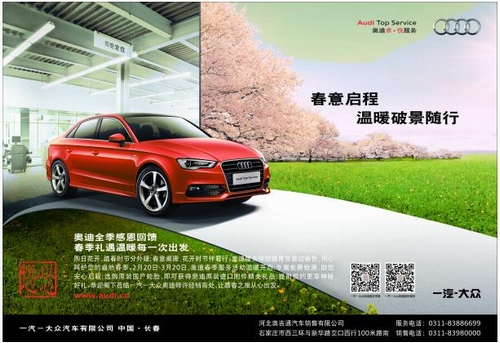 奥迪车主全季感恩回馈,春季礼遇温暖每一次出发. 奥迪服务伴您踏青赏景迎春色,用心呵护您的盎然春季. 2016年2月20日-3月20日,奥迪春季服务活动温暖开启,恭迎阁下莅临西三环·奥吉通奥迪,让踏春之旅从心出发. 时间:2016.2.20-3.20 地点:西三环·奥吉通奥迪 一重礼 30项厂家指定项目车辆安全检查服务 二重礼 18项本店特色车辆关爱及油液免费添加--价值2000元新春礼包 三重礼 车内空气质量免费检测+免工时更换防雾霾空调滤芯 四重礼 践行增值服务典范,超值亲情礼包馈赠 续保新春大礼包--价值3000元 春季服务内容: A-服务礼包 1、预约客户赠送厂家礼品 2、免费添加机油及各种油液--原厂机油放送! 3、检测防冻液+玻璃水冰点 4、四合一检测线进行制动力测试、刹车测试、悬架测试并出具检测报告. 5、蓄电池蓄电量检测(出具蓄电池检测电子检测表) 6、空调暖风系统检查,让您的爱车给你一个更清洁的环境 7、进店产生消费再赠888元美容卡,给家里的那个她一份爱 8、入店期间免费体验颈肩按摩、放松身心,留住美好感觉. B-续保礼包 1、清洗节气门一次 2、空调检查和杀菌一次 3、内饰清洗一次 4、全车封釉一次 (3和4客户进店保养时可选做一项) 5、四轮定位一次 6、1500元单块喷漆券一张 (4和6只能二选一) C-二手车礼包 1、专业110项免费评估车辆,预约可提供上门评估服务. 2、成功收购非本品牌车辆,二手车部赠送客户价值:480元内饰清洗一次.成功收购同品牌车辆,赠送客户价值:1280元的漆面封釉一次.同品牌置换赠送全车膜,价值4260元.(限春季服务月活动期间) 3、准交易二手车免费提供寄售、车辆翻新服务. 4、成功购买非奥迪二手车,赠送客户价值480元内饰清洗一次.成功购买同品牌车辆,赠送客户价值:1280元的漆面封釉一次.成功以旧换旧赠送全车膜(魔术师或圣科)价值:4260元. 河北奥吉通汽车销售有限公司 抢购热线:0311-83980000 公司地址:石家庄市西三环与新华路交口西行100米路南 |