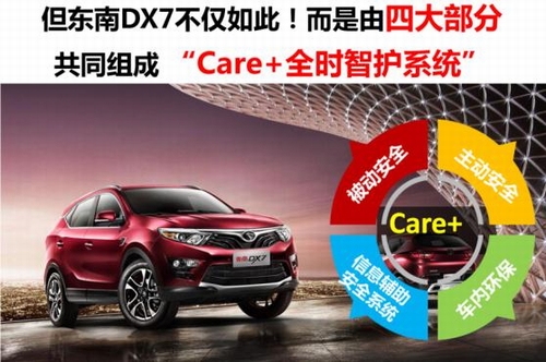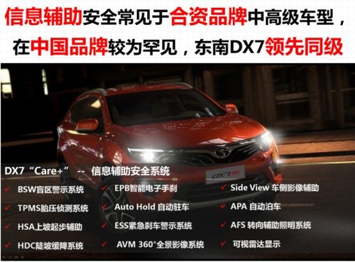 近日,多个车企紧急召回近130万辆存在安全隐患的汽车,汽车安全问题已成为影响消费者选车购车最重要因素之一.作为一款持续热销的SUV,东南DX7显然有备而来.因此在2015版新规的C-NCAP碰撞测试中,东南DX7以55.7高分获得五星安全认证,位于所有已参与新规碰撞测试的同级SUV中的第1名,成为同级最安全SUV! 之所以取得如此优异的成绩,与东南DX7"Care+全时智护系统"息息相关. "Care+"究竟是什么?下面助你1分钟读懂东南DX7"Care+全时智护系统"! DX7"Care+ 全时智护系统"之所以领先同级,首先体现了"人无我有"的原则--配备了越级的信息辅助安全系统,全面提升行车安全. |
