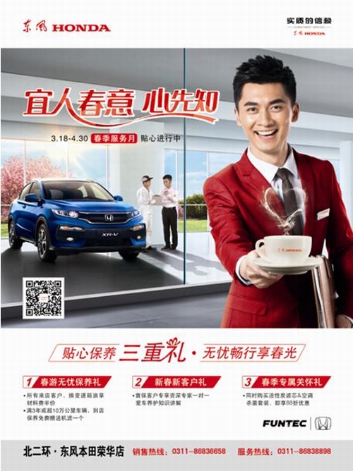 告别了严寒的冬季,温暖的春季来临,俗语说:一年之计在于春,爱车的朋友们一定也深知春节正是汽车保养的重要时节。每逢换季,汽车和人的身体一样,也需要从内到外适宜调一番整才能保持最佳的活力。 温暖的春季已悄悄来临,季节的突然转换,我们时常会说,春捂秋冻。可是,您知道您的爱车也需要在这个时候进行无微不至的关怀吗? 东风本田温馨春日服务月3月18日-4月30日感恩起航! 为节省您的宝贵时间,我们建议您预约,我们将提前为您准备,恭候您的到来。 2016东风Honda春季服务月活动内容: 惊喜一:春游无忧保养礼 所有来店客户,换变速油箱油享材料费半价;满3年或超10万公里车辆,到店保养免费赠送机滤一个。 惊喜二:新春新客户礼 首保客户专享资深专家一对一爱车养护知识讲解。 惊喜三:春季专属关怀礼 同时购买活性炭滤芯&空调杀菌套装,即享8.8折优惠。 东风Honda只为您起航!价值在于感恩,更在于信赖!享受用车,尽在东风本田春季服务月! 公司名称:东风本田汽车荣华特约销售服务店(河北省首家东风本田专卖店) 公司地址:北二环与建华北大街交叉口西行600米路北 销售热线:0311-8683 6658 售后热线:0311-8683 8898 置换热线:18603266327 24小时救援:0311-8683 8898 续保热线:0311-8683 1320 |