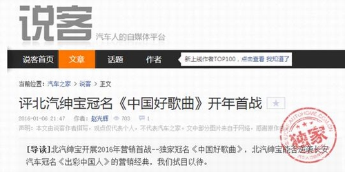好歌曲的飘红收视率也让北汽绅宝品牌声名鹊起,"中国好汽车"成了北汽绅宝的代名词,"信自己,有我就有路"的品牌口号更是广为记忆。 根据百度指数显示,自《中国好歌曲》开播以来,"北汽绅宝"的日平均搜索指数保持在8000左右,同比去年上涨824%,环比上涨230%。截止3月18日,搜索关键词"第三季中国好歌曲",百度已录入1560000个相关链接。新浪微博#中国好歌曲#话题已经吸引到18亿阅读量,952.2万次讨论。 行业翘楚 国产品牌引发行业媒体关注飙升 北汽绅宝冠名第三季《中国好歌曲》的消息在汽车圈里引起巨大反响。众多媒体和圈内人士就对北汽绅宝的创新营销及品牌推广称赞连连。 业界内外诸多媒体评论:"中国好汽车"和"中国好歌曲"的联手是一次双赢式的合作。对《中国好歌曲》而言,我们遍布全国、线上线下的的各级平台,是其有力的宣传阵地,可以帮助节目推动中国音乐原创文化的繁荣;而对我们而言,这是北汽绅宝在第二个五年计划、在工业2.0时代"品牌向上路"的重要举措,也是我们成为中国这个全球最大汽车市场的有力竞争者的重要布局。 首映结束后,一位媒体老师在汽车之家说客上写道,"北汽绅宝+央视+中国好歌曲+乐视三支力量合作,要大于长安汽车+央视+出彩中国人,本次冠名的营销影响力要超越长安汽车冠名活动可能性非常大"。而《新闻晨报》也发表文章评论:"大家在看《好歌曲》的时候想到了北汽绅宝,有更多地消费者去关注这个品牌,这就已经成功了。" 跨界联合,成就品牌力与销量的双向提升 而从目前的营销效果来看,《中国好歌曲》的营销价值已经初显成效。借助《中国好歌曲》的引爆力,一方面,我们北汽绅宝品牌有了大规模的曝光;另一方面,观众潜移默化地领悟到我们"坚持原创"和"品质向上"的品牌精神。 与《中国好歌曲》深入绑定带来的惊喜,其实已经超越了"广告"身份,借助《中国好歌曲》这个平台,我们结交了一大批年轻有活力的粉丝,并强化了与固有粉丝的品牌粘性,最终建立起围绕北汽绅宝的"朋友圈",实现品牌溢价。从现实效果来看,本次跨界营销所达成的效果,甚至可能超越了销售公司的预期。 北汽绅宝经销商评价此次合作说:"自从冠名《中国好歌曲》以来,进店客流量环比增长了近15%,诸多绅宝老客户对品牌的黏度增强,有些老客户主动向新客户炫耀这次营销模式",终端销售顾问也都更有底气了。" 本次与中国好歌曲的合作,在营销圈内形成了中国好原创、中国好歌曲、中国好汽车的热议话题。通过冠名第三季《中国好歌曲》,更多年轻观众记住了我们"北汽绅宝"这个品牌名称。而《中国好歌曲》坚持原创的理念,也让消费者充分感受到我们在坚持原创、创新道路上的自强不息。作为中国汽车品牌的代表,北汽绅宝在向着成为国产领先汽车品牌的道路上,正在不断前行! |