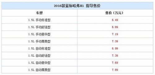 日前,长城汽车官方宣布,2016款蓝标哈弗H1正式上市,新车推出了搭载1.5L发动机的共计8款车型,售价区间为6.49-7.89万元.详细售价请见下表: 目前,哈弗H1系列共有红标和蓝标两款车型在售,本次上市的车型作为现款蓝标哈弗H1的改款车型,其在外观细节方面有所调整.其中新车前格栅采用了全新的黑色网格状设计,相比现款车型三横幅的镀铬处理更加动感.同时,该车装配了一款全新造型的16寸双色铝合金轮圈,并匹配有红色的刹车卡钳. 内饰方面,2016款哈弗H1中控台造型基本延续了现款车型的设计,并将提供红黑、棕黑、纯黑、黑米及黑灰五种内饰配色供选.配置方面,新车配备了右前部盲区可视系统、换挡拨片(自动挡车型)、GPS+北斗双模导航系统、手机互联等装备. 动力方面,2016款蓝标哈弗H1继续搭载一台1.5L自然吸气发动机,最大输出功率106马力,峰值扭矩138牛·米.传动方面,与发动机匹配的为5速手动和6速AMT变速箱. |