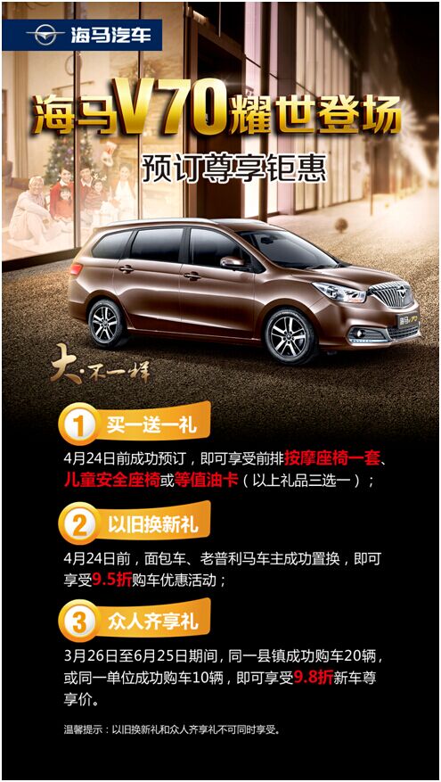 2016年4月7日,齐鲁车展在山东济南国际会展中心拉开帷幕。作为华北地区乃至全国都颇具影响力的汽车盛会,齐鲁车展吸引了众多知名车企参与。海马汽车携旗下全新MPV车型海马V70首发亮相并公布预订价格和促订优惠政策。 定位于自主中高端MPV的海马V70预订价区间为8.5万元-11.5万元,极具市场竞争力。同时现在预订更可享受"预订尊享钜惠三重大礼"! 纯正轿车平台带来更加舒适的驾乘感受 随着生活水平的日益提高,以及二胎政策的全面放开,越来越多的消费者对用车的功能性和舒适性提出了更高要求,MPV车型逐渐成为家庭出行的最佳选择。目前MPV市场两极分化,自主MPV集中在低端,舒适性档次感较差;而合资MPV又高高在上,不够亲民。自主中高级MPV海马V70的出现弥补了这中间的"灰度"。 "16年前海马汽车就推出了普力马,这款车一度占据国内家用MPV市场85%的份额。"海南一汽海马汽车销售有限公司总经理蔡锋介绍道,"海马汽车对中国MPV文化和消费观念有着深刻独到的认识。海马汽车在此基础上,历经三年多,基于新一代纯正轿车平台升级打造出了海马V70,无论是配置还是技术工艺,均超越主流自主产品,拥有挑战合资对手的实力。" 海马V70基于海马最先进的纯正轿车平台打造,在舒适性、操控性等方面有轿车般的高品质水准。海马V70提供5座、6座、7座三种选择,座椅组合灵活多变,不仅保证了日常实用性,还可满足消费者的多样选择。在安全方面,海马V70是自主同级唯一全系标配ESP的MPV车型,并配备了丰富的主、被动安全设施。科技化程度也是海马V70区别于其他自主MPV车型的一个点。全系标配电子手刹,配备8英寸超大显示屏、定速巡航,并配有强大的HM-Link车联网系统。在舒适性方面,自主同级唯一采用成本更高、性能更好的前麦弗逊后多连杆四轮独立悬挂;领先同级的强效动力组合1.5T+6AT/2.0+6MT带给消费者酣畅舒适的驾乘体验;超大空间和高档内饰更将带给消费者头等舱般的尊享舒适感受。不仅如此,海马强大的NVH降噪科技保证了车内图书馆级别的静谧空间。 海马V70通过"不一样的空间、不一样的舒适、不一样的科技、不一样的安全"四大产品特征,以全面超越同级竞品的舒适性和豪华档次感,将为广大追求生活品质的家庭带来"适不可挡 大不一样"的驾乘新体验。 匠心工艺感悟城"适"魅力 "品质海马 中国符号"是海马的品牌诉求,海马一直将品质作为企业的核心竞争力,"精益求精"的工匠精神是海马近三十年来的坚持和写照!海马汽车在此次车展上启动了海马V70"匠心o城适"主题营销活动。该活动组织媒体以及广大消费者探寻中国各地各行各业最具匠心的各类艺术工艺,同时感受匠心之作--海马V70带来的舒适体验及高品质享受。活动首站为潍坊站,将通过探寻潍坊风筝的制作过程来展现延续千年的匠心工艺。 每一届齐鲁车展,海马汽车优秀的产品都给观众带来了诸多惊喜。今年除海马V70外,"幸福家轿"第四代福美来、时尚SUV海马S7也都到场助阵。海马的每一款车型都是匠心之作,未来,海马汽车将继续为广大消费者带来更多更好的产品。 |