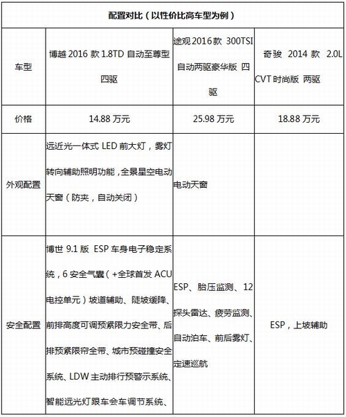 2016年是美国大选之年,作为一个政治小白,对保守派和自由派间的撕扯完全看不明白,看美国大选不过是隔岸观火看个远热闹,看国内SUV市场的血战的热闹才能看出点门道。话说美国总统4-8年才换届,中国的SUV市场江山却常易主;人家一做八年的总统都要换换了,咱们买车的人是不也该“大选”辆新SUV,享受一把技术进步、设计更新、附加值升级的市场进化红利呢? 如果给消费者15万-20万元的购车预算,想必选择一款合资SUV的概率更大,例如大众途观,又或者是日产奇骏。没办法,这两款车早已名声在外,在消费者看来开这样的车才更有面子,更显逼格。但如果预算降到10万-15万元之间,途观或者奇骏就只能望其项背了。有没有实力碾压途观、奇骏,价格却在10万-15万元之间的候选者呢?您猜对了,我想到了神车博越。博越、途观、奇骏,咱就让三部热门车同台PK一场,陪纠结的买家玩次SUV间的大选。 价格 价格上吉利博越“完爆”大众途观与日产奇骏。吉利博越于3月26日上市,官方售价9.88万元-15.78万元,在享受厂家4000-6000元补贴之后,终端售价9.48万元-15.18万元。大众途观官方售价19.98万元-31.58万元,在终端优惠2.2-2.3万元后,售价约在17.8万元-29.3万元之间。日产奇骏官方售价为18.18万元-26.78万元,在终端优惠2.1-2.3万元后,售价约在16.1万元-24.5万元之间。博越最高配售价比途观与奇骏最低配售价还省银子,高下立判。 造型:小鲜肉还是老复古? 纵观近年来美国大选两阵营的候选人,颜值较高的克林顿、奥巴马、希拉里属于城市知识分子支持的民主党,他们更年轻;颜值差一些的布什、特朗普归属于美国南部乡村支持的保守派共和党,相对高龄,可见颜值不仅和基因有关,也取决于年龄和教养、背景。SUV界的情况也是如此,高颜值SUV不仅靠品牌的历史,更靠造车厂家当下的实力、设计理念,中国SUV界的新来者,正在颜值上先压倒老神车们。 吉利博越 2016款大众途观 日产新奇骏 在几款车中,年轻的吉利博越外观明显更考究,悬浮式车顶,猎豹仿生学造型车身,原创感强,耐看。垂垂老矣的途观采取大众品牌的家族式前脸设计,让人们感到有些审美疲劳了,很有特朗普那种老气横秋的商人范儿。日产新奇骏前脸有了新鲜造型,看起来比途观年轻一些,但是整体造型有点粗线条,有没有点像年轻版的大炮筒特朗普? 内饰:2016年中国人的审美观 2016款博越内饰 2016款途观内饰 新奇骏内饰 三款车中博越的内饰给人印象最深,中控台上的西湖拱桥、水波纹涟漪等中国元素带来的艺术感,NAPPA真皮座椅和方向盘的质感,这种低调奢华气质,有点欧系豪车的范儿,让很多人难以相信它的平民价位。再看两位大哥: 2016款途观内饰和上代车比有细节调整,但整体造型有失传统和老气。奇骏的灰米配色使内饰带有家居朴素感,工艺细腻。 空间:势均力敌 虽然空间比拼显得有点low,但传统的中国车主对空间还是很重视的。经过对比,发现新奇骏的长、高、轴距均占据优势,但基本上三款车的空间都能确保乘客的舒适驾乘。 动力操控:比账面也看调校 从发动机的账面数据看,博越明显超过了两位身价不菲的大哥,从油门实际动力输出看,博越的调教是偏线性的,动力输出绵绵不绝,但也不会那么突兀,这为它的操控感奠定了不错的而基础。途观按理说主打动力操控,可是它的发动机故障不少,油门踏板不太敏感,动力输出有点疲软。奇骏车身尺寸最大,但动力输出明显不足,油门反应自然缓慢一些。 再比底盘,博越底盘有一种质感,在日系的绵软和德系紧绷之间寻找平衡,转向系的调教有力道,方向盘的尺寸、握感、回馈都很到位,配合敏捷的油门反应,能给驾驶者一定玩操控的自信。奇骏的底盘调校主打舒适,缺点就是过弯有点侧倾,上高速有些发飘。途观底盘过滤颠簸的能力不错,但是转向不算精确,开起来甚至有点像日系车飘忽忽的感觉,没有大众车宣传的稳稳抓地的感觉,这意外的飘,令人联想说话不打底稿的特朗普,每天都说要重振美国雄风,却明显缺乏政客基本素养,不如律师出身又实干的希拉里更有公信力。 配置:智能时代、理念时代 博越比合资车的配置丰富许多,这在意料之中,意料之外的是TA有更多逼格的智能配置,而且把安全、舒适、智能便利上升到系统工程的境界。博越的“安全识别圈”的理念,运用一系列最新的智能配置,把事故风险一层层高效规避掉,这和奔驰的Pro-Safe,宝马的综合安全防护理念不谋而合;被科学的理念系统组织起来的智能配置,安全效果自然会加倍。博越的人性化舒适系统、智能互联系统也比合资对手理念前卫一些,给合资对手好好上了一课。这样看来,对保守派消费者来说,博越最大的缺点就是它不是合资车,就像年事较高南方白人男性总是倾向于把票投给男性白人候选人,背后的心理是:“女总统?外来户?那靠谱吗?” 对买家来说,淘车比美国人选总统还纠结,总统是好是坏全民一起担着,花血汗银子买的车可是自家养、自家开。眼看高逼格神车一波波涌来,建议眼花的消费者一款一款去试驾,因为自己开着合适的,才是好车。 |