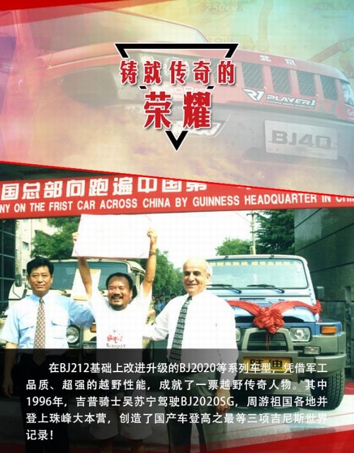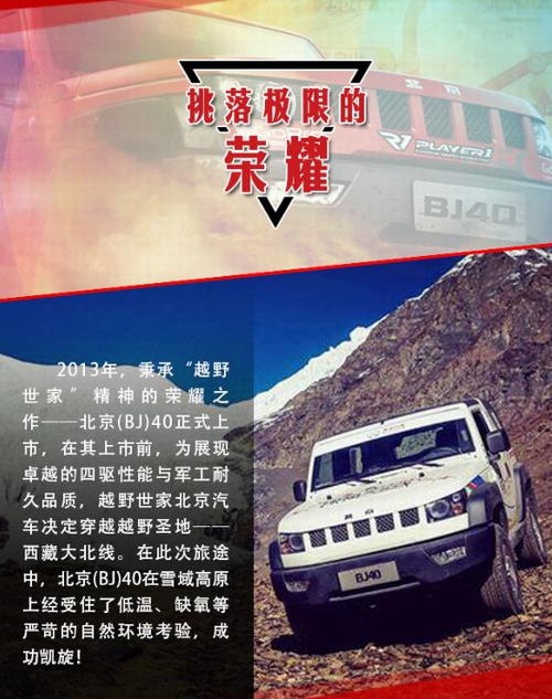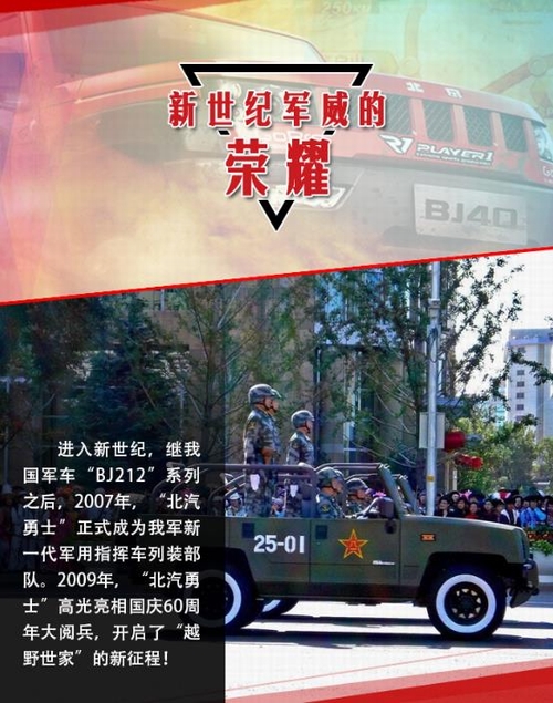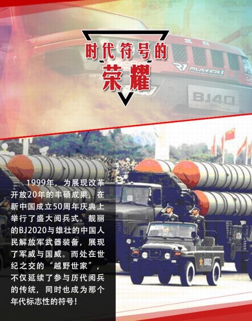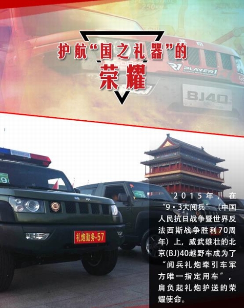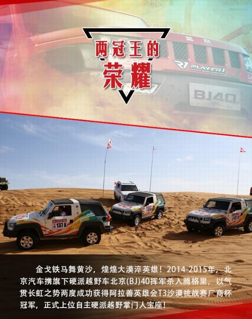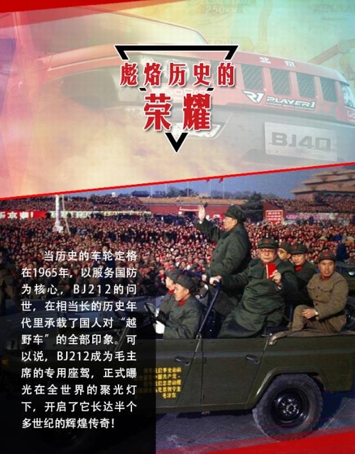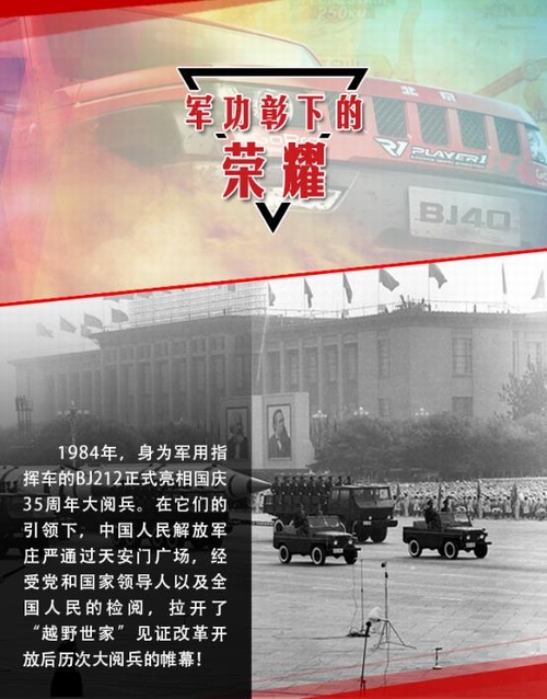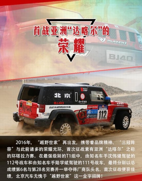 2016年5月15日—29日,“越野世家”携旗下悍将北京(BJ)40首次征战素有“亚洲达喀尔”之称的环塔拉力赛,便取得了厂商队头名的荣耀战绩。环塔拉力赛至今已成功举办十年之久,具有里程长、路段艰险等特点,而且伴有沙尘暴、高温、缺水等极限状态,是对车辆可靠性与耐久性的全方位考验! 出征此项赛事,并取得辉煌成绩,再次验证了北京(BJ)40军工耐久品质,为“越野世家”北京汽车书写新的荣耀时刻。而事实上除了此次参赛外,诞生于上世纪五六十年代的“越野世家”,一直荣耀傍身且见证了新中国一个个重要历史时刻,堪称辉煌经典!今天我们就来扒一扒它的历次荣耀时刻。 如果说,北汽“越野世家”在那一代人心中,曾是一种无法磨灭的情怀,曾象征着一个时代。那么,从踏上环塔征程、夺取厂商队头名的这一刻起,“越野世家”正缓缓开启一个全新的荣耀时代。这个时代,关于情怀、更关乎于实力! |