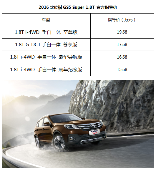日前,广汽传祺 2016款GS5 Super 1.8T四驱车型正式上市,售价仅15.68万元起。与原车型相比,2016款GS5 Super1.8T性价比优势最高可达3.5万元,进一步捍卫了“全能SUV”的价值标杆地位,而与同级同配置合资SUV相比,其性价比优势超5万元起! 持续引领中国品牌向高端市场发起冲击。 全能SUV超值登场 性价比领先同级合资5万起 传祺GS5 Super上市以来,其超高价值已在市场上留下深刻烙印,此次推出的1.8T 四驱车型后,更是具备了“T动力+7速双离合+四驱+超高价值”四大优势,成为同级别中最具价值的中国品牌SUV,在与同级合资竞争中再添重磅砝码。 以2016款GS5Super 1.8T i-4WD手自一体至尊版为例,原价为23.18万元,现售价仅为19.68万元,却搭载了30万级豪华SUV才有的前碰撞预警、车道偏离预警、盲区监测等智能驾驶安全系统,同时配备德国最新第九代ESP、TPMS智能胎压监测系统与AFS智能大灯随动转向系统,超高性价比同级罕见。与现代IX35、本田CR-V等热销合资品牌SUV相比,2016款传祺GS5 Super1.8T在配置、性能与空间等方面的价值优势起码在5万元以上。 做为15万“全能王”SUV,传祺GS5Super霸气外观、澎湃动力、扎实的底盘调教和远超同级的科技配置,使其性能傲视同级。其搭载的1.8T高效涡轮增压发动机,应用内置双平衡轴,动力性能与NVH全面升级,在1700~5250rpm超大转速范围内,持续输出242Nm的峰值扭矩,配合7速G-DCT手自一体变速箱,换挡时间仅需0.2S,百公里综合油耗仅为8.4L。 GS5 Super在欧洲高性能底盘基础上开发而来,采用高位斜置双叉臂前独立悬挂和带垂向控制臂多连杆独立后悬挂,配备博世最新ESP为核心的八位一体主动安全系统,配合i-4WD智能适时四驱系统(最大后轮传动比可达100%,最大爬坡度高达49%),操控性能在同级SUV中无出其右;采用GAC五星安全车身,乘员舱95%以上的骨架采用高强度钢材,符合美国专业严苛的SUV抗压设计,安全性能无与伦比! J.D. Power双冠王 GS5 Super品质堪比30万级豪华SUV 广汽传祺自诞生以来,便坚守品质底线,只做“加法”有口皆碑。GS5 Super自2014年上市以来,便接连征服各种最恶劣的环境,展现硬朗风范。2015年9月,传祺重走长征路,GS5Super克服高原险途,接连征服5座海拨近5000米高原;2015-2016年,传祺GS5Super连续两年挑战牙克石,在零下30度的酷寒,西伯利亚的冷风肆虐下,在极寒冰原上踏雪起舞。 在2013~2015年J.D. Power中国新车质量研究(IQS)报告中,GS5系列在中型SUV细分车型中拿到95分的好成绩,超越大众途观、本田CRV、IX35等合资品牌热销车型,勇夺中国汽车品牌车型第一位,成为中国车型品质标杆;而广汽传祺亦连续三年荣膺中国品牌汽车榜首,不断强化消费者信心,引领中国品牌价值升级,品质堪比30万级豪华SUV。 完善SUV矩阵,力拓15万级以上高端SUV市场 15万元以上高端SUV市场历来是高性能车的阵地,由强调动力性和科技感的欧美系SUV占据,以性价比为优势的自主品牌数次冲击皆无功而返。传祺GS5系列依靠高度原创的风尚造型、欧系高端底盘、丰富的科技配置及媲美合资车型的工艺品质,成为最先成功突围15万级中高端SUV市场的中国品牌车型,改变了国内中高端市场版图。 明星车型传祺GS4正高歌猛进,上市周年收获23万车主,挺进SUV前二。GS5 Super1.8T四驱车型超值上市,使传祺SUV产品矩阵得到进一步扩充与延伸,为传祺GS5系列再添性价比优势和市场竞争筹码,完整覆盖10-20万SUV市场,对合资SUV形成全面对标之势。与同级合资SUV相比,GS5 Super1.8T四驱版性能优势同级无可匹敌,售价比同级合资竞品更低3-5万元,性价比优势无可匹敌。 业内人士分析,随着消费者对于中国品牌的认知与好感度正在不断提升,借助GS5积聚的市场人气和上佳的市场口碑,得到完美升级的GS5 Super有望重塑高端SUV市场格局。 |
