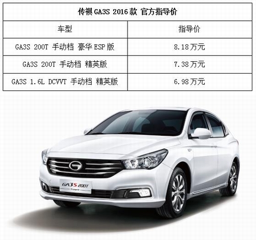 2016年8月3日,广汽传祺旗下轿车军团再添生力军,GA3S全新200T车型携1.6L车型超值上市,推出200T手动豪华版、200T手动精英版以及1.6L DCVVT 手动精英版共3款车型,售价6.98万元起。 传祺GA3S自2014年上市以来,凭借着时尚的外观、强劲的动力以及五星安全品质收获不俗口碑。此次推出的200T全新车型,动力、舒适和安全方面全面升级,性价比全面提升,堪称“6万级安全动控大师”。 动力方面,GA3S 200T搭载传祺国际领先技术水平的Ti POWER第二代200T发动机,这也是在传祺轿车上首次现身。该发动机运用GCCS燃烧控制专利技术、加工精度达到微米级的缸孔珩磨技术与低惯性电控E-Turbo涡轮增压器与等多项世界领先技术,坐拥大扭矩、低油耗以及噪音小的三大核心优势,最大功率137马力,1500转便可输出202Nm的峰值扭矩,全面领先同级。与此同时,GA3S 200T匹配爱信五速手动变速箱,有效降低油耗,创造同级超低5.9L百公里综合油耗。 传祺全新第二代200T发动机 操控方面,GA3S 200T继承传祺品牌一贯优异的底盘性能DNA,采用四轮全独立悬挂系统,麦弗逊前独立前悬架配合多连杆后独立后悬架,堪称同级独有。值得一提的是, 广汽传祺在整车的正向开发中不断科学优化NVH系统。作为GA3S 的升级版,200T车型新增添了18项静音科技,通过新增及优化隔音棉,加强阻尼垫和补强胶优化,优化悬架调校,全面阻隔吸收来自发动机及行驶中所产生的噪音,为消费者带来安静舒适的驾驶环境。 舒适的驾驶环境 外观方面,除了前后增加了镀铬装饰之外,GA3S 200T采用16寸时尚动感铝合金轮毂,车尾增加“200T”标识以显示新车身份。 前部新增镀铬饰条 全新16寸轮毂 新增“200T”尾部标识 与此同时,广汽传祺将携手汽车之家启动“高品质国民家轿普及计划”,此次推出的A级家轿市场全新战略车型——GA3S 200T手动豪华版及原有的1.6L自动精英版\豪华版共三款车型将同步登陆汽车之家车商城独家销售。对广汽传祺而言,这是电商战略的重要一步,双方未来将以消费者为核心,探索汽车+互联网的新模式,为消费者提供更好的汽车生活服务。 |