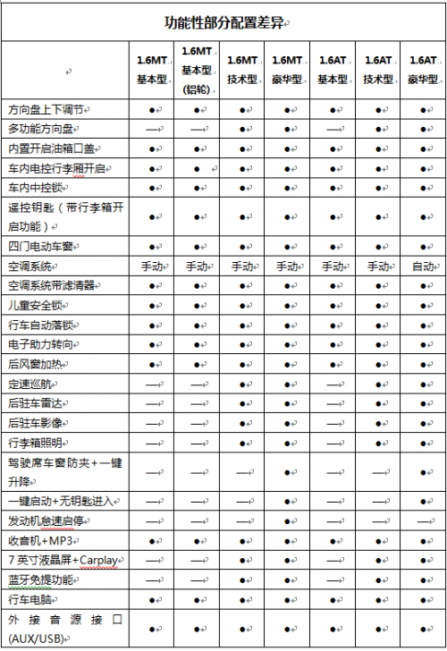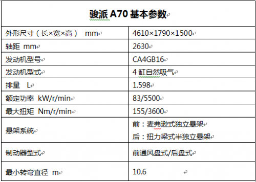 2016年8月22日,天津一汽首款A级车骏派A70正式下线,与此同时,全系车型配置表也同步发布。骏派A70共推出了7款车型,动力部分均搭载的是中国一汽自主研发的CA4GB16系列1.6L自然吸气发动机,手动挡搭载由杭齿提供的5速变速箱,自动挡搭载爱信全新第二代F21系列六速手自一体变速器。作为一款主打高品质和高安全性的A级车,骏派A70除了拥有极具个性的时尚帅气造型外,其丰富的安全与,科技配置也颇具亮点。 骏派A70拥有七款车型,包括手动挡和自动挡车型,手动挡车型包括基本型、基本型(铝轮)、技术型、豪华型四款,自动挡包括基本型、技术型、豪华型三款,共有7种颜色供消费者选择,分别是星河银、雅典银、皓月白、霓彩红、香槟金、魅力紫和印加棕。 骏派A70外形尺寸为4610×1790×1500MM,轴距为2630MM。全系搭载中国一汽自主研发的CA4GB16自然吸气发动机,排量为1.6L,最大功率83KW,最大扭矩155Nm。充沛的动力让骏派A70拥有了很好的操控表现,悬架部分采用前麦弗逊式独立悬架、后扭力梁式半独立悬架的设计,延续了德系平台的经典悬架搭配,保障了良好的底盘稳定性和操控性。前通风盘后盘式制动器,也有效提高了刹车系统的工作性能,驾驶更安全。10.6米的最小转弯半径,也领先部分同级别合资车型,车身操控更灵活。 在车身外观方面,骏派A70的全系车型差距不大,均拥有飞翼式鹰眼前大灯,大灯带透镜且光线高度均可调节。广泛应用于中高级车领域的LED光导式后尾灯也是全系标配,使用寿命长且更加时尚。手动挡和自动挡的豪华型版本还加入了LED日间行车灯,在进一步提升行车安全性的同时,也让骏派A70更加具有科技感。 骏派A70全系均为电动调节车身同色外后视镜,且带有侧转向灯。车窗玻璃除手动挡和自动挡的基本型外,均为着色隔热玻璃,提升了乘车舒适度。进气格栅和车窗下部全系均有镀铬装饰,提升了外观的质感,成为点睛之笔。车尾部分全系均有鸭尾式扰流板,除了提供更好的空气动力学效果外,也让车尾更加具有运动感。骏派A70除手动挡基本型外,均采用了铝合金材质的轮毂,视觉效果突出。 骏派A70的豪华型提供了发动机装饰罩盖,能够在保护引擎的同时,让发动机舱更加规整、美观。进入车内,基本型、技术型车型采用了由美国江森提供的环保织物座椅,而豪华型则为真皮座椅并且配备了真皮方向盘。全系均为带有白色自发光的炮筒式仪表盘,不仅阅读清晰,而且更具科技感。 在储物空间方面,前座中央扶手箱、前后排杯架、前排阅读灯、车顶眼镜盒、后门内饰板储物格等均为全系标配,多达10余处的储物空间能够满足用户在车内的储物要求。座椅部分基本型和技术型均提供四向手动调节,而豪华型则可达到六向调节。后排座椅头枕均可手动调节,且全系后排座椅可整体折叠,营造更大更平整的后部储物空间。 骏派A70全系提供方向盘上下位置的调节,技术型和豪华型还加入了多功能按键,能够更加方便驾驶者操作车内功能。为了方便驾驶者,全系车型均提供内置开启油箱口盖、车内电控行李厢开启、车内中控锁和遥控钥匙(带行李箱开启功能)。同时,骏派A70还全系配备了EPS电子助力转向,能够提供更加轻盈的操控感。 骏派A70的空调采用了世界500强品牌的成熟产品,全系均带有滤清器,能够有效过滤花粉等颗粒物,保证车内空气质量。自动挡豪华型采用了自动空调,其他车型为手动空调。为了保证乘员安全,儿童安全锁为全系标配,且配备了行车自动落锁功能。 在功能配置方面,除基本型外,技术型与豪华型均标配定速巡航、倒车雷达、倒车影像以及行李箱照明功能,大大提高了驾车的便利性和安全性。豪华型车型还拥有一键启动+无钥匙进入功能,不仅方便、也更加有面子。手动版豪华型独有发动机怠速启停系统,能够有效降低油耗,节能环保又省钱。 多媒体系统上,骏派A70全系配备收音机功能,且能够支持MP3格式的音乐播放。技术型和豪华型拥有7英寸高清触摸屏,自带手机互联系统,能够方便的与手机双向互动。此外,行车电脑、外接音源接口也是全系标配的。为了保证良好的视听效果,全系匹配松下扬声器。其中,基本型配备4扬声器,而技术型和豪华型则配备6扬声器,音响效果出众。 安全性能是所有车主最为关心的部分,而安全性恰恰是骏派A70最大的产品亮点。全系标配主副驾驶安全气囊,自动挡豪华型还提供了前排侧气囊、前后贯通式头部气帘,达到了6安全气囊的超高安全保护标准。配合安全气囊,骏派A70全系提供前排预紧张式安全带,能够在碰撞发生时将乘员向后锁定在座椅上,避免气囊弹出或前车窗碎裂对前排人员造成伤害。同时全系前排头枕均能够做到防挥鞭伤,能够在车辆被追尾时,保护前排乘客的颈部安全。 除全系标配ABS+EBD系统外,骏派A70的豪华型装备了博世最新版本的9.0版ESP电子车身稳定系统,能够提供刹车辅助装置(BA)、牵引力控制系统(TCS)、车辆动态稳定控制(VDC)、轮胎气压报警装置(TPMS)等高阶安全功能。自动挡豪华型还独有坡道起步辅助系统(HHC),能够在山路或桥梁较多的路况下,提供更轻松的驾驶体验。更为贴心的是,全系配备碰撞后车门自动解锁功能,能够在碰撞发生后车体车门变形的情况下,方便救援人员施救或车内乘员逃生。 通过对骏派A70全系配置表的综合对比来看,手动挡及自动挡车型的配置表现差异不大,除了最低配车型受