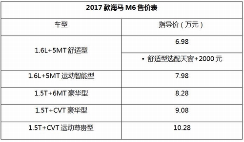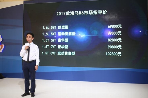 9月30日,2017款海马M6河北区域上市发布会在石家庄秋季国际汽车博览会上活力开启,海马汽车携“全时互联运动轿车”2017款海马M6,以及“8万级专业SUV引领者”海马S5、“5万元级高品质家轿”海马M3全阵容亮相,闪耀全场,为河北车迷带来了一场精彩的汽车盛宴。 运动基因再凸显2017款海马M6领“秀”全场 9月30日,石家庄秋季汽车博览会现场,海马汽车2017款海马M6 惊艳亮相,吸引了众多媒体和消费者的关注。2017款海马M6共推出5款车型,官方指导价6.98万元-10.28万元,谱系设置更聚焦,运动基因更凸显,越级配置更优化,综合竞争力全面提升,实力领跑A+级轿车细分市场。车展现场,海马汽车销售有限公司华北大区经理阎石对2017款海马M6进行了分享介绍,并公布了售价。 “运动+互联”再升级 2017款海马M6智能领衔 2017款海马M6沿用鹰翔式前脸、利刃腰线+内凹线设计,整车外观流畅,时尚动感,风阻系数低至0.28;长宽高分别为4700mm×1802mm×1478mm,轴距2730mm,全面领先竞品,打造A+级标杆车型。 2017款海马M6更加注重运动基因的细节雕刻:全系增配的“湾流式”LED日间行车灯与“矩阵式”全LED尾灯交相辉映,有效提升行车安全之余,使整车更显炫动。16寸飞翼式“5V”箭簇铝合金运动轮毂,重量更轻、强度更高,而且双色搭配视觉效果更佳。 2017款海马M6内饰增加“倒置拱桥”式红色装饰条,与双色运动包裹座椅搭配,极致运动氛围激发强烈的驾驶欲望。 动力操控方面,2017款海马M6保留现款1.6L+5MT、1.5T+6MT和1.5T+CVT三种成熟动力组合,在输出澎湃动力的同时保证平顺性;采用前麦弗逊+后多连杆四轮独立悬架系统,CTCC冠军血统成就海马汽车史上最强运动底盘。 |
