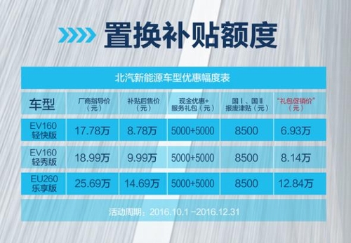受够了燃油车排放超标的你,是否在等待心仪的车型进入视线?为实现节能减排目标,北京市“十三五”期间将重点淘汰国Ⅰ、国II标准轻型客车,鼓励车主选择清洁能源车型。此前响应绿色出行号召,北汽新能源公司推出行业首个惠及人群最多、体量最大的1.8亿元换新基金。该项政策对国I、国II燃油车车主,置换北汽新能源纯电动车将提供万元购车礼包。加上国家对淘汰老旧小客车进行最高8500元补助,国Ⅰ或国Ⅱ车主置换北汽新能源全系乘用车型,累积相加最高可补贴18500元! 最高优惠1.85万 北汽新能源为燃油车主送福利 作为中国纯电动汽车领军企业,北汽新能源派出纯电动车中的“花旦”车型EV160、EU260解决燃油车尾气排放超标困扰。也就是说,如果您有一辆“遭嫌弃”的国Ⅰ或国Ⅱ燃油车,置换北汽新能源车型,在享受国家对小客车最高补助8500元后,继续享受北汽新能源万元购车大礼,双重购车补贴最高可达18500元。即日起-12月31日,最低6.93万元即可购得高品质经典车型EV160,最低12.84万元即可轻松入手爆款明星车型EU260,性价比爆棚,机会难得。 电动汽车界最强实力明星引爆车市 火爆纯电动车市场的EV160是经典实力派座驾,常年稳居细分市场销量TOP1,且增长势头稳健。经典实力派EV160采用国际领先的普莱德/磷酸铁锂动力电池技术,具有能量密度大、重量更轻、可靠性更高、使用寿命更长等特点。行驶里程超60万公里,车主可放心行驶10年,这也正是EV160能在纯电动车市场长盛不衰的“核芯”所在。 同时,EV160还是纯电动车界的“时尚王子”,拥有堪比特斯拉的10.4寸液晶大屏,以及智能语音控制、定时充电、智能导航等新一代车联网功能。驾驶着EV160酷到如同站在时尚潮流之巅。PM2.5空气净化系统,只需5分钟就能带来车内清新的好空气,EV160丰富的配置让车主直呼“赚到了,有一种买到德系车的感觉”。 与EV160同样吸睛的明星成员EU260则是一款国民好家轿,许多对这款颜值高、性能强、还有“超级长跑王”之称的明星车型“预谋已久”的粉丝,攥足了劲等待这次优惠幅度的到来。 作为家轿首选车型,EU260得益于e-Motion Drive超级电驱技术,不仅在加速性、操控性上同级最优,其续航里程根据真人实测更可高达350公里。随着天气愈加寒冷,EU260配备低温预加热功能,在北方冬季续航里程依旧不打折扣。同时为了满足年轻车主的互联网需求,EU260搭载丰富的多媒体娱乐内容和i-link智能网联系统,智能科技范分分钟惊艳朋友圈。安全方面,EU260采用超高强钢车身、四位一体的主动安全系统和超越同级的前后雷达、胎压监测装置,为车主带去动感愉悦的驾乘体验。 凭借多年的飞速发展,北汽新能源在全国已拥有无数忠实“电粉”。为了让车主们与北汽新能源始终处在“蜜月期”,北汽新能源大力建设全国服务网点,以“智?惠?管家”服务聚合了移动充电资源和售后服务资源,提供车辆诊断及主动关怀服务的同时为用户免费安装充电桩,且在充电接口兼容性问题上,北汽新能源车型兼容市面上90%以上的充电桩。此外,北汽新能源提供核心部件(含电池)8年15万公里的超长质保,让车主买车后也万事无忧,这样的服务比男友的关怀还要贴心,产品之外如影相随的优质服务已成为用户选择北汽新能源的重要原因。 对于有着尾气排放超标困扰的国Ⅰ或国Ⅱ车主来说,在12月31日前置换北汽新能源EV160或EU260,将以史上最超值的补贴钜惠“抱得美车归”。不难想象,北汽新能源此波狂欢优惠,或将开启中国燃油车置换纯电动车的新时代。 |