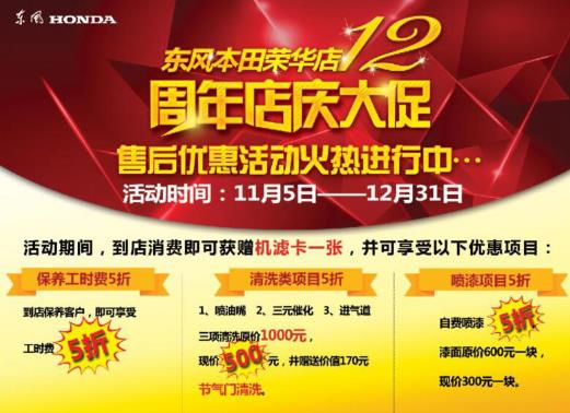 时值东风本田荣华店12周年店庆月,为感谢广大客户一直以来对北二环东风本田荣华店的支持与厚爱,东风本田荣华店特推出“12周年店庆大促,售后优惠活动火热进行中…”感恩回馈活动,活动期间到店客户即可获赠机滤卡一张,更多咨询:0311-86838898。 活动时间:2016年11月05日至2016年12月31日 活动地点:北二环东风本田荣华店售后服务部 活动预约:0311-86838898 活动内容:活动期间,到店消费客户即可获赠机滤卡一张,并可享受以下优惠项目: 1、保养工时费5折 到店保养客户,即可享受工时费5折。 2、清洗保护类项目5折 喷油嘴、三元催化、进气道三项清洗原价1000元,现价500元,并赠送价值170元节气门清洗;单次一项清洗200元。 3、喷漆项目5折 自费喷漆5折,漆面原价600元一块,现价300元一块。 公司名称:东风本田汽车荣华特约销售服务店(河北省首家东风本田专卖店) 公司地址:北二环与建华北大街交叉口西行600米路北 销售热线:0311-8683 6658 售后热线:0311-8683 8898 置换热线:0311-86839198 24小时救援:0311-8683 8898 续保热线:0311-8683 1320 |