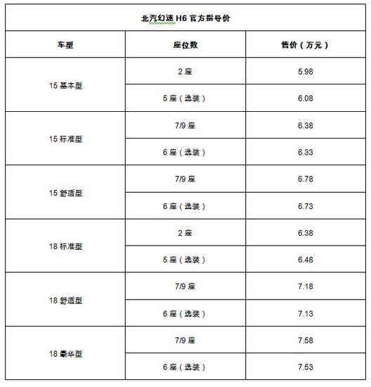 2016年11月18日,北汽幻速H6于广州车展正式亮相,并宣布上市。这款不容小觑的高效宽体商务车将推出2/5座物流、6/7/9座轻客两种类型共计6款车型,包括1.5L和1.8L两种排量。官方指导售价为5.98万-7.58万元,上市后将要与风行菱智等热门车型正面角逐。 造型时尚 幻速H6前脸沿用北汽幻速专属家族式造型设计,双横条镀铬进气格栅现代感十足,中央部位镶嵌品牌LOGO,有效保证空气流通的同时增加外观辨识度;侧面采用高低双腰线设计,视觉上动感十足;尾部造型方面追求简洁,车牌上方宽幅镀铬装饰条将两个尾灯自然衔接,不仅凸显出整车的商务风格,更加彰显其大气稳重的独特魅力。幻速H6采用了以黑色为主的内饰配色,并带有木纹装饰条的中控台,使整车更具品质感。 多能空间 北汽幻速H6是针对商旅、物流市场研发的一款多用途商务车,因此在车型尺寸上毫不吝啬。幻速H6高顶版车型的车身尺寸为4925×1834×2115mm(低顶为1980mm),轴距更是达到3080mm,均领先同级车型。中间两排座椅采用1+1独立座椅,部分车型配有第二、三排1+1独立座椅可滑动,靠背可调节,头枕可调节功能,为乘客预留更加充足的独立空间。尾门开启拥有掀背式、对开门两种方式,座椅布局灵活,空间利用率高,车厢最大容积可达6469升(可容纳12360瓶330ml的易拉罐饮料),满足不同用户群体对空间的需求。 高效节能 搭载1.5L与1.8L两款自然吸气发动机的幻速H6,最大功率分别为83千瓦和103千瓦,峰值扭矩分别为150牛·米和180牛·米,均具备可变气门正时系统(VVT)、直列四缸、多点电喷等先进技术。其中,1.8L发动机为全铝合金发动机,重量轻,散热好,燃油经济性与动力媲美传统2.0L的发动力。 新车匹配5速手动变速箱,平均油耗8.2L-8.4L/100km,符合国五排放标准,实现“大动力、低油耗、低排放”的优异动力性能。 越享舒适 北汽幻速H6为商用做了大幅度优化,宽大的侧动滑门,让货物搬运与乘客进出方便省力;大尺寸车窗玻璃,为驾驶者提供优良的视野;8英寸中控MP5液晶大屏(带GPS导航+蓝牙系统)、豪华皮质座椅(第二、三排座椅可前后滑动,第四排座椅可放倒翻折)、倒车影像、EPS电子助力转向等越级配置更是锦上添花,保障驾乘舒适体验的同时,保证了空间的灵活多变。 安全可靠 安全配置是拷问一辆车品质的关键之处,北汽幻速H6全系标配倒车雷达、中控锁、驾驶席安全带未系提醒、车门未关报警、车身防盗系统等,部分高配车型还配有前排双安全气囊、发动机电子防盗等传统轻客未配备的越级安全配置,全面保障驾驶者的行车安全,为您的家人与事业保驾护航。 定位于“高效宽体商务车”的幻速H6集高性价比、多能空间、高效节能、越享舒适、安全可靠五大优势于一身,目标用户为政府机关、企事业单位和私营企业主。北汽幻速H6以载货为主,并兼容兼顾客运功能,体现了北汽幻速与时俱进的造车理念。“大众创业,万众创新”是我国当下着重推进的经济发展政策,北汽幻速为响应国家大政方针的号召,为众多普通创业百姓量身定做亲民好车,凸显轻客产品更高速的运营效率和更大的容积率,拓宽百姓致富路,为与新的经济形势的接轨贡献一份力量。 |