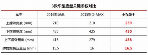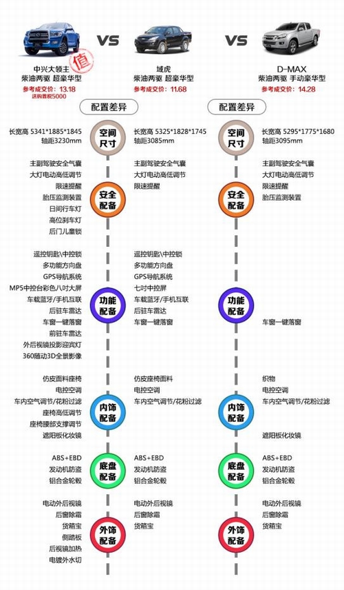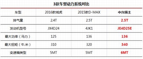 中兴领主在内饰上比较大气新颖,黑棕双色搭配的内饰是车内的亮点,采用目前国际流行的软包内饰,整个车内的档次感也明显提升,这样的搭配确实很符合当下年轻消费者的审美。 具体来看,2016款域虎配备了主副驾驶安全气囊、7吋中控屏、多功能方向盘、GPS导航系统、车载蓝牙/手机互联等,配置还算丰富但却少了一些黑科技;2015款D-MAX的配置相对单调很多,尤其像多功能方向盘、GPS导航系统、MP5中控彩色大屏、前后驻车雷达等功能配置都没有;中兴领主的配置似乎更吸睛,悬浮式仪表台、8吋中控彩色全触控显示屏,看上去不仅炫酷,也更具档次感。另外、360度随动3D全景泊车、外后视镜投影迎宾灯、主驾座椅8向可调、胎压胎温监测、智能行车电脑等功能配置一应俱全。 动力性能 2016款域虎配备的发动机是江铃自主“改良”后的产物——JX4D24,并非原汁原味的福特货,从发动机的参数就能明白这台引擎与其它两款车型存在的差距,最大功率仅125马力,最大扭矩锐减为310牛.米。 2015款D-MAX搭载的4JK1发动机,由五十铃自己研发生产,4JK1发动机可以根据发动机转速的不同,通过调节排气流通截面的方式,极大的改善发动机低转速时的响应时间和加速能力。最大功率136马力,最大扭矩为320牛.米。 中兴领主搭载五十铃引进欧洲技术生产的VM发动机,与吉普牧马人同款,噪音震动小,开起来就是汽油机的感受,动力强,加油相应快,尤其是高速动力强。最大功率136马力,最大扭矩为340牛.米。 发动机技术带来的直接结果是,中兴领主与D-MAX的马力旗鼓相当,都是136马力,动力都很充沛,而域虎125马力与两者相比则有一些差距;中兴领主340牛.米的最大扭矩在三款车型中是最优秀的,甩出其它两款不小的差距,强大的马力输出和扭矩表现,加速和爬坡能力不在话下。 而变速箱的配备,更能明显看出中兴领主的诚意满满,域虎是全系标配5挡手动变速箱,D-MAX只有超豪华型配备5挡手自一体变速箱,其它都是5挡手动变速箱,而中兴领主全系标配6速手动变速箱,这在很大程度上提高了燃油经济性。 底盘性能 在悬架结构方面,2016款域虎采用的是前双横臂扭杆式独立悬架,后悬架为钢板弹簧非独立式,符合皮卡车型的基本配置;2015款域虎采用了前双横臂独立悬架,后钢板弹簧非独立悬架,弹性元件为5片钢板,与其它车型保持一致。 中兴领主采用的是双横臂+螺旋弹簧+横向稳定杆结构,较其他大皮卡产品摆臂更宽,上下摆臂距离更大。这就使得车辆的操控性更佳,颠簸路面过滤强,乘坐者感觉更舒适。 从3款车型的底盘参数不难看出,中兴领主的底盘优势明显,采用这种专业的越野底盘,这就使得车辆的操控性更佳。高速时,转弯平顺安全感好,路感扎实、响应清晰,加速超车心里有底;转向时,转向指向精确,回位性好;越野时,最小离地间隙220mm ,坑洼泥泞越野路面轻松应对。 看完上面的PK,相信大家已经从外观、内饰、动力和底盘四个维度详细了解了这三款高端皮卡,下面我们从1张对比图中更加直观地看一下中兴领主、江铃域虎、D-MAX的具体产品参数和配置差异: 从上面的配置对比图可以看出,相比域虎和D-MAX,中兴领主除了在外观尺寸上占有优势,在配置上也更丰富更人性化,诸如8吋中控彩色全触控显示屏、360度随动3D全景泊车、日间行车灯、外后视镜投影迎宾灯、座椅高低可调等配置也是中兴领主所独有的,在同级别车型中,皮卡车型能有这样的豪华配置,也是很少见的。 综上对比所述,在这三款高端皮卡车型中,江铃域虎和D-MAX已经名声远扬,各方面综合实力都很拿的出手,但就各个方面深入对比可看出,中兴领主确实后生可畏。中兴领主是综合表现最好的一款产品,外观和内饰都要比前两者更具前瞻性和时尚感,动力和较好的底盘越野能力是它最大的亮点。如此看来,中兴汽车这个皮卡老手确实有意将其打造成一款既适合家用、又适合户外越野的高端皮卡车型,着实用心,相信中兴领主的市场表现会相当不错。 |