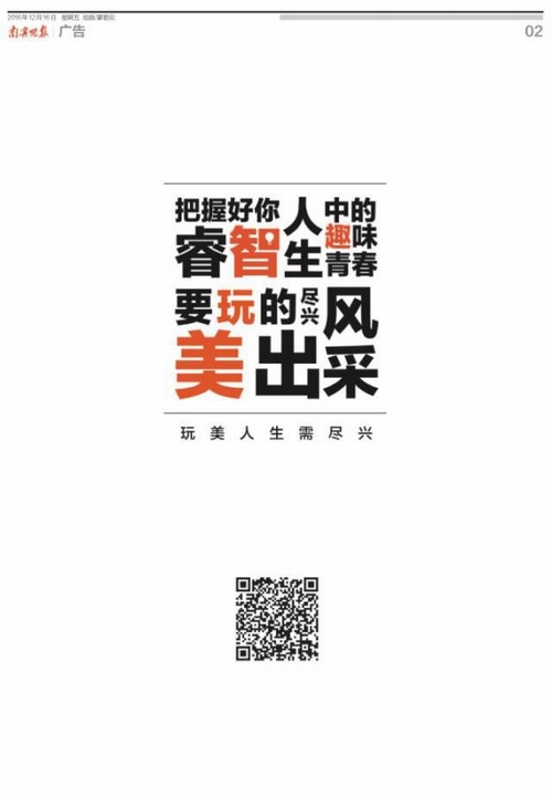 近日,在几大地方报纸(哈尔滨生活报、南宁晚报、郑州晚报、西安晚报)刊登的一则整版广告引起了不小轰动,很多人都被搞得一头雾水。整个版面既没有品牌logo露出,又毫无视觉冲击力的画面。此事件一时间引起了广泛热议。 也正是这样别具一格的悬疑色彩,才越发吸引人们的注意,拿起报纸,仔细端详,一定要探个究竟。 整版广告一眼看上去只是一堆大小不同的文字堆砌,仔细阅读起来才会发现另有玄机。充满正能量的态度标语中隐藏着四个颜色鲜艳的大字,“智、趣、玩、美”确实藏得很深。而下方的二维码正是打开折扇疑惑大门的钥匙。 是的,好奇心驱使,看到这则广告的人们纷纷拿起手机扫描了二维码,然后终于进入到了这个神秘世界——瑞虎3x“寻人启事”H5。据悉,X-Game嘉年华活动正在招募各地技艺超群的运动达人,街舞王子、跑酷魔童、滑板妖龙、轮滑疯子……都是寻找对象。大家既可毛遂自荐,又可推荐好友。 |