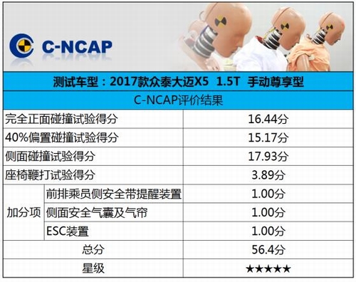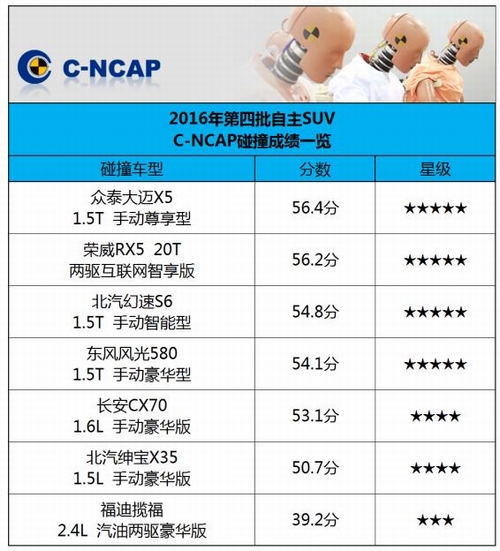 2016年12月28日,中国汽车技术研究中心公布了最新一批车型C-NCAP(中国新车评价规程)碰撞试验结果,大迈X5以56.4分的高分获得2015版C-NCAP五星安全评价,并成为该批次自主SUV车型中的第一名。 2015版C-NCAP评价规程于2015年7月份正式实施,该规定对评分标准进行了更加严格的规定,并进一步提高了五星安全评定的标准(五星成绩从原来的52分提高至54分)。 同批次自主SUV第一名 大迈X5获2015版C-NCAP五星安全评价 大迈X5以56.4分的优异成绩获得C-NCAP五星安全评价,并成为参与本批次安全碰撞测试的7款自主SUV车型中的第一名。 五星级被动安全 全面保护驾乘人员 正面100%碰撞试验,测试车辆 100%重叠正面冲击固定刚性壁障:16.44分 |