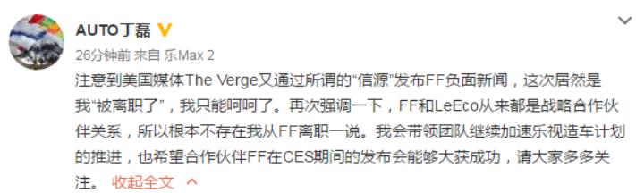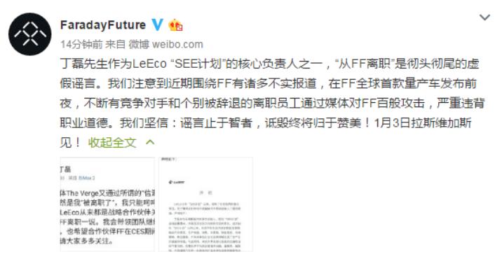 近日,关于乐视超级汽车联合创始人,全球副董事长丁磊离职的传言似乎有愈演愈烈之势。美国媒体The Verge的最新报道彻底将此话题炒热。The Verge消息中称,有“信源”报料丁磊已经从Faraday Future(简称FF)离职。 今日,丁磊通过微博回应“离职”传闻,称来自媒体所谓的“信源”消息是谣言。对于自己的无端“被离职”,丁磊表示“只能呵呵了”。同时,作为乐视超级汽车联合创始人,全球副董事长,丁磊再次声明,FF和LeEco从来都是战略合作伙伴关系, “从FF离职”更是完全不存在的事情。丁磊微博中表达了带领团队推进乐视造车计划的信心,同时表达了对1月3日LeEco战略伙伴FF首款量产车全球首发顺利举行的希望。 随后,乐视超级汽车官方微博对丁磊“被离职”的传言发出正式声明,声明中详细说明,丁磊作为乐视超级汽车联合创始人,担任乐视“SEE计划”全球副董事长、中国及亚太区CEO的职位没有变化。 作为中国汽车行业的领军人物,2015年9月,丁磊出任乐视超级汽车联合创始人、全球副董事长、中国及亚太区CEO。从其个人履历来看,丁磊未曾有过入职FF的经历,此次突然曝出丁磊从FF离职的消息确实有点空穴来风。 但是,在智能互联网电动车领域迅速发展的FF似乎并没有受到丁磊“被离职”谣传的影响。1月3日,FF首款量产车将在美国拉斯维加斯全球首发,从其前期发出的预热海报及视频来看,这辆被称为“新物种”的首款量产车也确实十分有看点,外观设计、性能表现上都很值得期待。 在FF紧锣密鼓地准备其首款量产车全球首发时传出这样的谣言,FF官方转发了丁磊微博和乐视超级汽车的声明,并表明“谣言止于智者,诋毁终将归于赞美!” 目前,本次“被离职”事件的相关方丁磊本人、乐视超级汽车和FF都已经针对谣言进行了澄清,此次“乌龙”事件应该也将告一段落。谣言之外,1月3日,FF首款量产车全球首发似乎更值得关注。 |