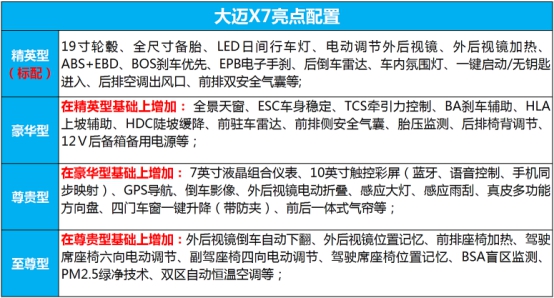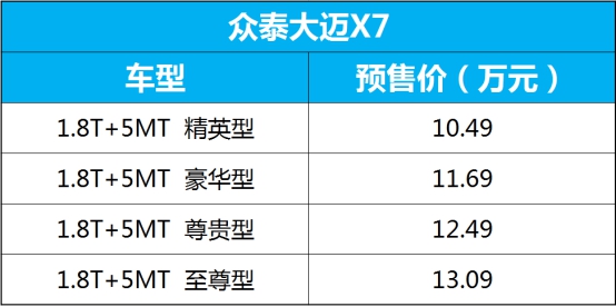 1月9日,大迈X7发布了其预售价,新车将首先推出1.8T+5MT动力组合的4款车型,预售价区间为10.49—13.09万元。据悉,目前大迈X7实车已到店并接受预定。 大迈X7是众泰大迈推出的首款中型SUV,其长宽高为4736×1942×1672mm,轴距更是达到了2850mm,比素有中级SUV“标杆”之称的汉兰达还要长60mm,在同级中处于领先水平。 外观方面,大迈X7采用了大量平直的线条,饱满的车头曲线轮廓营造出很强的力量感。前大灯组与中网采用一体化的设计,两条银色镀铬饰条贯穿整个前脸,使得前脸看起来更加的深邃。大迈X7侧面采用双腰线的设计,凸显了整车的肌肉感,前倾的腰线使得整车看起来有一股蓄势待发的冲劲。 配置方面,预售10.49万元的精英型配备了19寸轮毂、全尺寸备胎、LED日间行车灯、电动调节外后视镜、外后视镜加热、ABS+EBD、BOS刹车优先、EPB电子手刹、后倒车雷达、车内氛围灯、一键启动/无钥匙进入、后排空调出风口、前排双安全气囊等配置,且以上配置均为全系标配。 豪华型在精英型基础上增加了全景天窗、ESC车身稳定、TCS牵引力控制、BA刹车辅助、HLA上坡辅助、HDC陡坡缓降、前驻车雷达、前排侧安全气囊、胎压监测等主/被动安全配置。 尊贵型的配置则更为丰富,该车型配备了7英寸液晶组合仪表、10英寸触控彩屏(蓝牙、语音控制、手机同步映射)、GPS导航、倒车影像、外后视镜电动折叠、感应大灯、感应雨刮、真皮多功能方向盘、车窗遥控一键升降(带防夹)、前后一体式气帘等配置。 作为顶配车型,至尊型主要增加了舒适的人性化配置,外后视镜倒车自动下翻、外后视镜位置记忆、前排座椅加热、驾驶席座椅六向电动调节、副驾座椅四向电动调节、驾驶席座椅位置记忆、BSA盲区监测、双区自动恒温空调等百万级合资车上才有的豪华配置。而在雾霾日益严重的环境下,大迈X7还配备了PM2.5监测及净化技术,进一步体现了大迈X7的人性化设计。 动力方面,此次公布的4款车型将搭载1.8T涡轮增压发动机,最大马力177Ps,峰值扭矩245N·m,与之匹配的是一款5档手动变速箱。据了解,该发动机采用了低惯量涡轮增压技术,涡轮在1000rpm便开始介入,并在1750rpm-5300rpm常用转速区间内保持最大扭矩90%以上的持续平顺输出。据悉,未来大迈X7还将提供2.0T发动机匹配双离合变速箱的车型供消费者选择。 在去年大迈X5升级版上市发布会上,众泰大迈曾提出“专研需求 专注品质 专心服务”的产品核心理念。自曝光以来,大迈X7凭借时尚、硬朗的外观以及丰富豪华的配置受到了市场的极大关注。可以说,大迈X7的每一项配置都是目前市场中消费者接受度最高、喜爱度最强的,是切实的考虑到消费者使用的便利性和实用性的。而此次预售价的公布,大迈X7也实实在在的让消费者进一步感受到了这份专研需求、专注品质的诚意。因此,我们有理由相信,大迈X7又将会成为国内SUV市场中一款极具竞争力的热销车型。 |