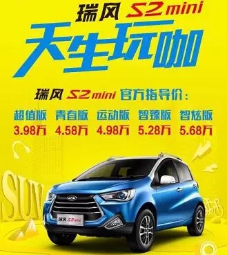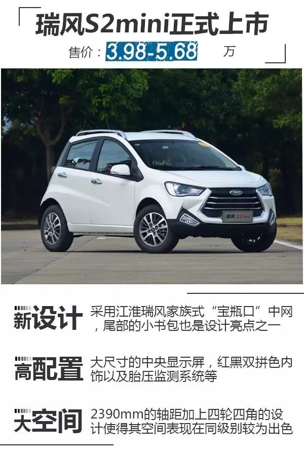 江淮汽车旗下拥有瑞风S2、S3、S5三款SUV车型,未来还将有更多细分产品补充到江淮SUV矩阵中。编辑从江淮汽车官方获悉,全新小型SUV——瑞风S2mini于1月18日上午10点正式上市,新车共推出1.3L动力的五款车型,官方指导价格为3.98-5.68万元。待其推向市场后,将与长安CX20和哈弗H1等定位相近的车型展开竞争。 瑞风S2mini最大的卖点就是呆萌的外观和不错的配置,加之亲民的售价、适合年轻消费者或者家庭的人生第一辆车。新车上市后并没有直接的对手,其他合资品牌的入门级SUV与其比较都大出不少,瑞风S2mini占有天时地利,其未来的市场表现值得期待,或将成为2017年的第一匹车市黑马。 |