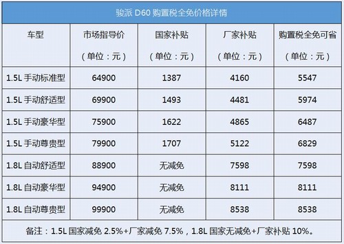 春风和煦,万物复苏,车市回暖。从3月1日起,凡购买天津一汽骏派全系车型的消费者,均可享受零购置税的优惠政策,即厂家将为用户提供车辆购置税的全额补贴。其中C-NCAP五星安全碰撞SUV标杆的骏派D60和高颜值、大空间、德系操控的骏派A70可享受最高8500元的购置税减免。 从2017年开始实行的购置税新规当中,对1.6L及以下排量的车型征收7.5%的购置税。天津一汽骏派发布购置税全免的政策,让消费者完全消除了缴纳购置税的后顾之忧。 骏派D60全系包括1.5L手动挡和1.8L自动挡共7款车型,最高可获得约8538元的购置税补贴。其中三款1.8L车型并不在今年国家补贴的政策范围内,厂家还是按10%的税率将购置税全免。骏派A70全系包括1.6L手动挡和1.6L自动挡共6款车型,最高可获得约5628元的购置税补贴。此外,在活动期间面向到店赏车的全国消费者,还可获得骏派为您精心准备的三重大礼。 骏派D60全系包括1.5L手动挡和1.8L自动挡,共7款车型。下表为骏派D60购置税全免后的价格详情: 骏派D60在外观上出自意大利宾法团队之手,整体动感流畅,给人带来强烈的视觉冲击。C-NCAP五星安全碰撞标杆,丰田动力+爱信变速箱带来富有激情的操控体验。 |