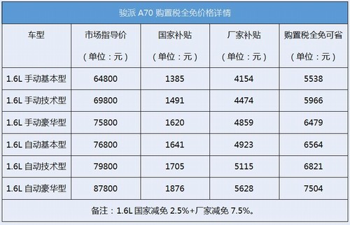 骏派A70全系包括1.6L手动挡和1.6L自动挡,共6款车型。下表为骏派A70购置税全免后的价格详情: 骏派A70的外观同样出自意大利设计团队,精致、犀利的整体设计令人眼前一亮。车内空间宽大舒适,相对同级车增加15%,做到了B级车的乘坐空间。操控上传承了德系优秀的底盘运动基因,带来更加出众的驾控体验。 天津一汽骏派车型推出全系购置税全免的政策,并为到店消费者提供了三重赏车大礼。体现出天津一汽骏派将不断满足购买高性价比A级车的消费需求,为消费者带来更多高品质的购车选择。 详情请咨询石家庄地区经销商: 石家庄然泰 电话:0311-83100092 地址: 河北石家庄市长安区_河北国际汽车贸易园区6排1号 |