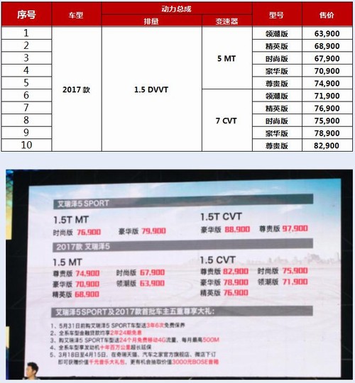 2017年3月18日,重庆国际博览中心,“艾瑞泽5 SPORT上市发布会暨奇瑞强音酷跑节第二季”盛大启航。今年的3月18日不仅是奇瑞汽车建厂“20周岁”生日,也是艾瑞泽5的“周岁”生日。全新高性能版艾瑞泽5 SPORT选择今天上市,希望以青春蓬勃的年轻化品牌新形象,为奇瑞“20岁”加油喝彩! 艾瑞泽5 SPORT 形象代言人、新生代实力偶像——“小猎豹”郑恺的现身,引来现场一片沸腾。在主流媒体、车主、跑步爱好者等近万人见证下,郑恺公布了艾瑞泽5 SPORT的价格和首批车主政策。共推出4款车型,售价76,900元到97,900元。 艾瑞泽5 SPORT及2017款首批车主五重尊享大礼 1、5月31日前购置艾瑞泽5 SPORT车型送3年6次免费保养 2、全系车型金融贷款均享2年24期免息 3、购艾瑞泽5 SPORT车型送24个月免费移动4G流量,每月最高500M 4、全系车型享发动机十年百万公里超长延保 5、3月18日至4月15日,在奇瑞天猫、汽车之家官方旗舰店、微店下订即可获赠价值千元音乐大礼包,更有机会抽取价值3000元BOSE音箱 同时上市的还有2017款艾瑞泽5车型,共推出1.5 DVVT动力共10款车型,售价63.900元到82.900元。 |