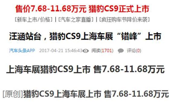 错过了品牌发布会高峰,也错过了媒体日报道高峰,但是在今天上市的猎豹CS9却没错过各大媒体的头条位置。 反车展“惯例”,猎豹CS9以营销创新打破数十年行业认知 众所周知,历次车展在媒体日做新车上市发布会是行业惯例。但每次大型车展,动辄数百款新车首发或上市,有限的媒体资源被全面抢夺。面对嘈杂的媒体环境,消费者对信息的筛选、辨别及阅读相比平常更难也更易流于表面。 当然,车展前提前举行品牌之夜专场活动是一个不错的选择。但是,与其与其他品牌抢夺媒体关注,不如直接瞄准消费者,让消费者参与到新车上市活动中,因为,在移动互联时代下,信息接收渠道更多元化,每个消费者都是自媒体。而猎豹CS9所瞄准的年轻消费群体,他们平时网络、手机不离身,这就要求企业在营销传播时要更加重视消费者的感受,把消费者当成重要的媒体进行更直接的沟通。 |
