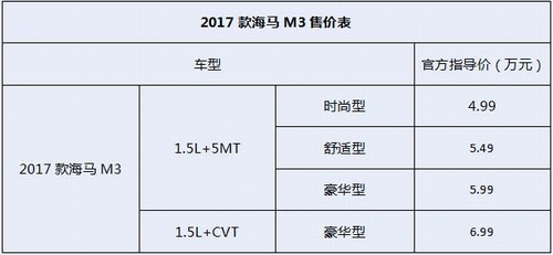 4月26日,“5万元级高品质家轿”2017款海马M3升级上市,共推出四款车型。官方指导价4.99万元-6.99万元,搭载1.5L+5MT、1.5L+CVT两种动力总成,新车聚焦年轻消费者的需求,在现有车型基础上进一步精简谱系,价格整体下探,配置全面升级,综合竞争力全面提升,以超高性价比为年轻消费者带来高品质的用车感受。 品质升级 配置全面优化 2017款海马M3在保持原有优势的基础上,从品质标准、尊享配置等方面进行全面升级,打造5万元级别优选车型,满足人们对于高品质、高配置的追求,为消费者带来尊崇的驾乘享受。 外观方面,保持“雄鹰展翅”设计理念,增配LED日间行车灯,配合翔翼式高亮前大灯、高穿透力前雾灯、follow me home”大灯延时系统等,极具辨识度及实用性。此外,2017款海马M3全系增配15寸十幅铝合金轮毂及四轮盘刹,极为吸睛。新轮毂质量更轻,制造精度更高,惯性阻力更小,不仅经济省油,更能提高直线行驶能力。四轮盘刹散热性能更好,抗热衰退能力更强,制动稳定性更好,且反应灵敏,有效提升车辆行驶的安全性及稳定性。 |