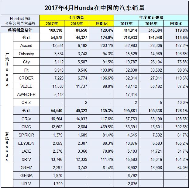 2017年5月9日,Honda发布2017年4月在中国的终端汽车销量。 1.Honda品牌以及合资公司自主品牌 Honda品牌以及合资公司自主品牌4月终端累计销售汽车109,518辆,去年同期比为129.4%,创4月单月终端销量的最好成绩。 其中,广汽本田汽车有限公司4月份终端销量为54,978辆,去年同期比为124.0%;东风本田汽车有限公司4月份终端销量为54,540辆,去年同期比为135.3%; 均创4月单月终端销量的最好成绩。 |