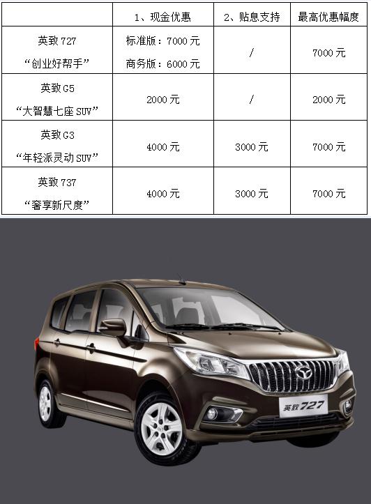 5月感恩季,潍柴英致汽车倾情回馈消费者:5月1日-5月31日,凡购买英致727、英致G5、英致G3、英致737系列车型,可获得现金奖励或贴息支持,其中,现金优惠最高可达7000元。如此大范围大幅度的促销,相信总有一款打动你。各车型优惠详见下表: 英致727:你的创业好帮手 七座宽大型商务车英致727拥有超高性价比、高舒适性轿车底盘设计、宽大空间、黄金动力组合等绝对优势,是创业者的购车良选。最高让利7000元后,市场成交价低至3.98万,感恩钜惠,诚意满满。 外观上,英致727采用了轿车化设计,打破微面车方正呆板的设计风格,更具商务气质;前低后高的腰线设计,俯冲式的车身姿态,时尚而不失动感。高颜值外观让你商务出行更有面子。 空间上,727的大空间和舒适度助你事业更上一层。2785mm超长轴距远超同级,1760mm的超宽车身,最大化内部空间。可前后调节、自由调整的黄金第三排,提升乘坐舒适性,第三排翻转后,后备箱的载物空间可达1697升。全车纯平地板设计,提高腿脚舒展性、方便货物堆放,商用拉货全无忧。 动力上,英致727搭载1.5L三菱技术的成熟发动机,匹配5速手动变速箱,黄金动力组合非常可靠、稳定,同时带来充沛的动力和超低油耗——百公里油耗仅6.7L。超低的油耗及稳定可靠的发动机和变速箱,每年可节约上千元的油费及车辆维护费,极大降低了用车成本。 配置上,727商务版配备倒车影像、8英寸液晶屏、手机互联功能,以及蓝牙电话等,实用有档次。全系标配高清LED背光仪表、EPS电动助力转向、主驾驶座安全气囊、三点式安全带、ISOFIX儿童安全座椅接口、遥控钥匙、遥控寻车、四门电动车窗等,配置丰富,全面提高你的用车生活质量。 英致G5:大智慧七座SUV 集空间、智能、动力、舒适于一身的“大智慧七座SUV”英致G5,可谓为时代而生。在“二胎政策”推出的同时,潍柴英致便响应“大家庭”消费者诉求,不但打造了“大空间”产品,更以智能的操控性能再次刷新市场七座SUV的产品力表现,实现驾乘体验双赢。 英致G5以2785mm的超长轴距为内部“大空间”布局提供无限可能;中排腿部空间818mm,加以后排795mm,超长腿部空间将舒适度完美释放;同级少有的纯平地板设计,保证驾乘舒适的同时方便堆放物品;2+3+2和2+2+3多种座椅布局,满足了消费者的多元需求。 在智能配备上,G5互联网版配备了领先同级的16英寸电容触摸屏,内置米图Meetwo智能互联操作系统,实现了多终端互联、智能信息显示、车辆控制、行车记录、车载WIFI热点、互联网连接、多媒体控制、无限安卓APP应用等多项科技感爆棚的实用功能,满足了时下用户群体对时尚科技范儿的追求,极大地优化了消费者的驾乘体验,全家的长途旅行不再枯燥乏味。 此外,三菱动力搭配德国格特拉克变速箱的黄金动力组合,在保证动力充沛的同时也实现了G5的卓越操控。如果你有一个“大家庭”,G5将装载全家的欢歌笑语,令假日游玩没有旅途劳累的烦恼。 英致G5售价6.98万起,享受2000元现金优惠后,最低价6.78万。机会难得,不容错过。 英致G3:年轻派灵动SUV 以酷炫造型、卓越操控、超低油耗赢得年轻消费群青睐的英致G3系列,在追求时尚动感的都市里成为前卫的领跑者,以绝对的性价比优势占据小型SUV市场。 新款G3前格栅采用高亮度镀铬五幅设计,造型时尚大气;车身采用直腰线设计,让整车显得更加硬朗、流畅;双色外后视镜、花瓣形熏黑铝合金轮毂等时尚、动感元素更加彰显炫酷气质。 除了时尚的外观,英致G3的操控性能更是领先同级。由美国顶级团队(AVT)精心调校的优异底盘,加上搭载的1.5升三菱技术自然吸气发动机和德国格特拉克的5速手动变速器这套黄金动力组合, G3可实现73公里/每小时高速过弯,高速行驶至160公里/小时,车身稳定不发飘、紧急制动不甩尾。39.57米的紧急制动距离实现同级最短,完美展现了英致G3稳定的操控性和安全性,百公里综合工况油耗6.8L,助力消费者都市领跑。 英致G3S在2016年底新增CVT车型,配置上全面升级,融合了双后视镜随动侧可视影像系统、倒车影像、EPS电动助力转向系统等高端配置,成为新手上路的“超级法宝”。驾驶G3,与志同道合的挚友们一同游山玩水,释放年轻活力,享受自然风光。 新款英致G3终端售价5.69万起,享受4000元现金奖励,或贴息支持3000元,最高优惠7000元后最低价4.99万元,心动就赶紧行动。 英致737:奢享新尺度,家庭商务舱 英致737定位于“家庭商务舱”,集MPV、轿车车型优良性能于一身,大空间,强动力,超舒适,稳操控是其最大卖点。如果你想在拼搏奋斗的同时,给家人带去更舒适的奢享出行体验,英致737将是不二之选。 时尚外观取代了方正死板的面包车造型;超长轴距搭配纯平地板打造高通过性的舒适空间;丰富智能配置搭配16英寸中控大屏,内装米图智能互联系统能实现多终端互联、车载WIFI热点、空调智能控制等多项功能;三菱原装发动机+德国格特拉克手动变速器和比利时邦奇CVT无级变速器的黄金组合实现了高效低耗、稳健操控。 英致737,一款家用、商务两相宜的优质座驾。5月感恩季,就让英致737陪伴你和家人度过美好的欢聚时光。 英致737终端售价6.18万起,享受4000元现金奖励,或贴息支持3000元,最高7000元优惠后低至5.48万元。 潍柴英致汽车洞察新一代消费者需求,用心提供让消费者满意的品质驾乘体验。5月推出的全系促销活动,更是体现潍柴英致坚持“用户至上”的原