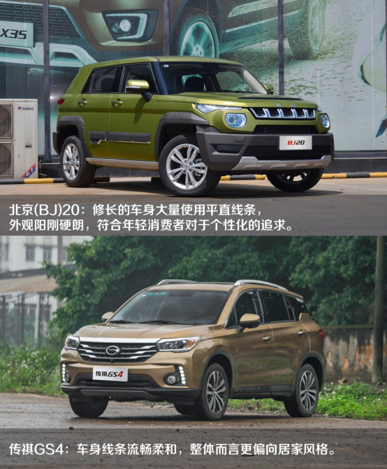 现如今,80后业已成熟,90后也逐渐走出象牙塔,步入社会,这些都市的型男素女正成为车市中最具活力,也最不可忽视的一股力量。对于这个全新崛起的年轻消费群体而言,SUV因为兼顾城市通勤和户外出游两大功能而备受青睐,尤其是A级SUV,既有SUV车型的特点,在价格方面也具备相对优势,已经成为他们购车的新趋势。但是,在当前市场上A级SUV车型众多,龙鱼混杂,到底哪一款能让这些年轻消费者心动,并真正承担得起他们的实际需求呢?今天,小编特意选取了两款颇具实力、市场关注度较高的买车必看车型——北京(BJ)20和传祺GS4,看颜值、比配置、拼实力,看看谁才是大家心目中的最佳选择。 外观:个性硬朗VS现代时尚 要想吸引年轻消费者,首先车辆的颜值就不能低,毕竟,谁不想开着一辆帅气的SUV出现在他人的目光中。在这一点上,BJ20绝对算得上抓人眼球,前脸采用了北京品牌一脉相承的五孔家族式格栅设计,加上犀利的分体式前大灯和硕大的双色保险杠,极具视觉冲击力和辨识度,让人过目难忘;修长的车身侧面大量使用平直线条,搭配车顶行李架、侧踏板、前后护板等元素,显得棱角分明,带给人一种大气、阳刚的感觉,这样一幅我行我素的个性硬朗范儿很容易引发年轻消费者的好感。 而GS4的外观设计呈现出来的则是另一种现代时尚感,车头进气格栅是家族化的“凌云翼”造型,三幅镀铬条呈翅膀状展开,虽然也赋予了这款车不错的原创度和辨识度,但以流畅的车身线条设计而成的它,整体而言还是更偏向居家风格。在当前城市SUV纷纷走清一色流线柔和路线,年轻一代消费者又越来越追求个性化的当下,GS4和BJ20比起来谁更吸睛,谁更贴近年轻消费者的追求和喜好,自是一目了然。 配置:超越同级VS主流水准 要想吸引年轻消费者,车型的配置也不能少。为了方便比较,本次选择了BJ20 1.5T CVT尊贵型和GS4 235TG-DCT豪华版这两款排量相同、价格相近的车型进行对比。 |