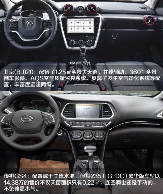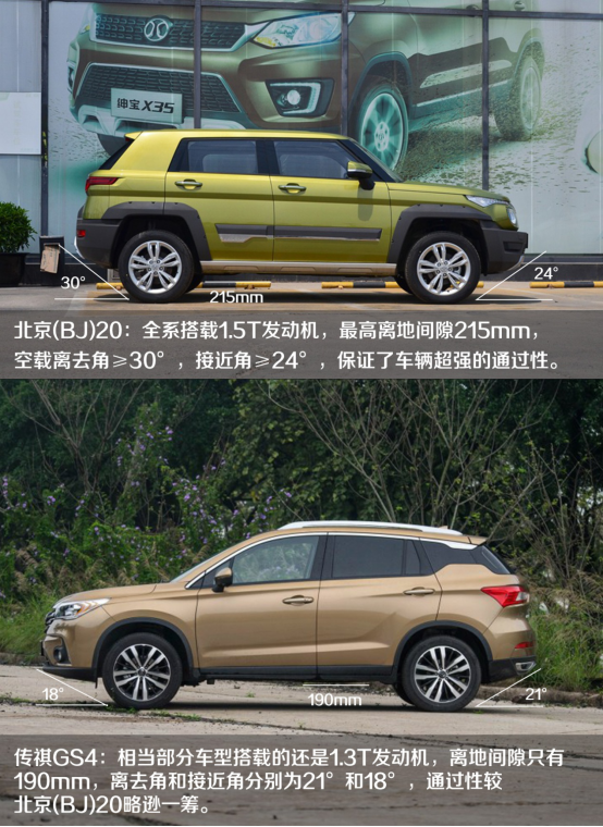 从上面的表格可以很明确地看出,BJ20的配置要比GS4丰富得多,不仅拥有远超同级的1.25㎡全景大天窗,便于欣赏更美的风景,还配备了刹车辅助、并线辅助、360°全景倒车影像、AQS空气质量监控系统、负离子发生空气净化系统等科技配置一路为自由的前行保驾护航。与之相比,GS4天窗面积仅0.22㎡,配置相对较少不说,空调还是手动的,不免略显小气,要知道,GS4 235T 7G-DCT豪华版官方售价为14.38万,比BJ20 1.5T CVT尊贵型13.98万的售价足足贵出4000元,两相比较,高下立判。 实力:高通过性VS日常通勤 当然,要想真正获得年轻消费者的欢心,最终还得看产品的硬实力,例如,在纵情山水时,车辆的动力和通过性就显得相当重要。在这方面,BJ20全系搭载1.5T涡轮增压发动机,最大输出功率110 kw,最大扭矩210N·m,动力充沛,再加上其拥有215mm最高离地间隙,空载离去角≥30°,接近角≥24°,保证了车辆超强的通过性,能从容应对各种复杂路况,让年轻消费者更加放心地去享受自由释放的乐趣。 反观GS4,在动力上有1.3T和1.5T两种排量可供选择,其1.5T发动机在动力参数上和BJ20相差无几,实力相当,然而1.3T发动机最大输出功率仅为101kw,最大扭矩202N·m,较BJ20略逊一筹,并且GS4离地间隙只有190mm,离去角和接近角分别为21°和18°,平时在城市通行倒是绰绰有余,倘若真要爬山涉水,去追求远方和自由,可能会显得有些心有余而力不足。 通过上面的一番对比,可以很明显的看出,无论是外观、配置、还是动力和通过性,BJ20都较GS4更具优势,很显然,GS4只适合城市居家生活,而对那些身处城市却还心向自然的年轻消费者而言,BJ20无疑是他们更好的选择。面对这样的BJ20,难道你还不心动?另据了解,为了让这些年轻消费者更加轻松的实现追求自由和远方的情怀与梦想,近期购买BJ20可享受36期“包牌贷”的购车政策,首付仅需1.88万即可提车,有意购车的朋友可不要错过。 |