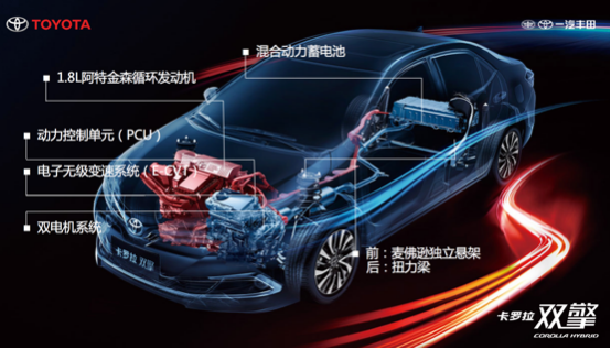 Point 3:油电双擎,动力强劲 卡罗拉双擎不仅“有颜值”、“有内涵”,更有一颗强大的内心。卡罗拉双擎的强大内心正是其搭载的丰田混合动力双擎系统,这个历经几十年发展已经被全球超过1000万用户肯定的技术,正在卡罗拉双擎的身上大放光彩。 卡罗拉双擎搭载的丰田混合动力双擎系统由一台1.8L阿特金森循环发动机和一台电动机组合而成,在PCU(动力控制单元)的调节和E-CVT(电子无极变速系统)的配合下,共同完成卡罗拉双擎的行驶任务,并且始终让车辆保持在最优动力输出的状态。 当电池电量充足时,卡罗拉双擎以低速起步,此时卡罗拉双擎的发动机不工作,完全依靠电动机作为主要的动力输出,安静且平顺,常用在极其安静的状态下(早晨、深夜的小区)不打扰别人以及想减少尾气排放时(进出车库);当车辆提速或者加速的时候,发动机会介入工作并且作为主要动力输出,高速状态下,电动机也会作为辅助配合发动机的行驶;值得一提的是,当卡罗拉双擎处于减速或者刹车的状态下,车辆会将多余的能量转化为电能,回收至混合动力蓄电池中,做到实实在在的节能环保,4.2L/百公里的综合油耗就是最好的佐证。 |